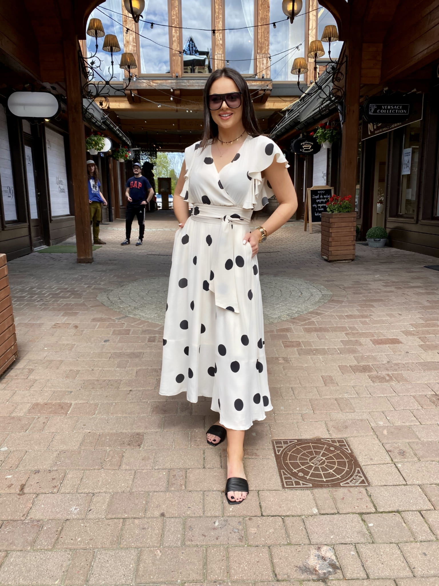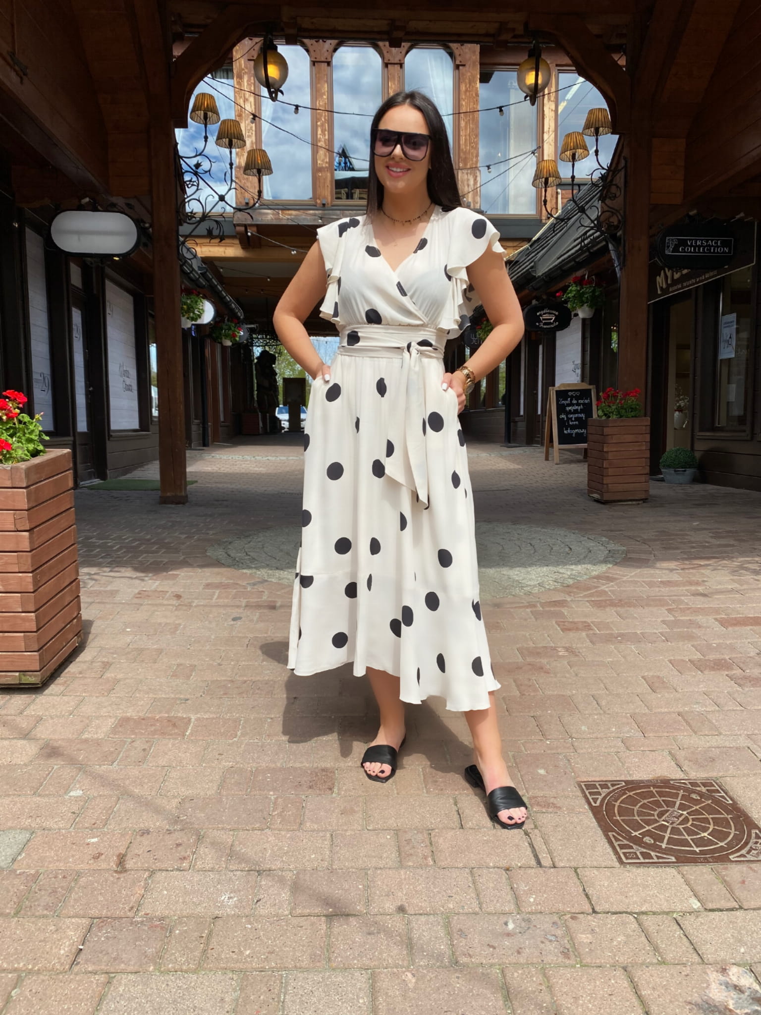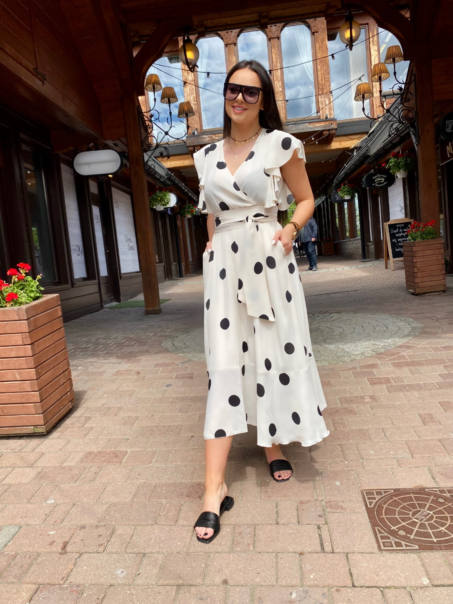 White airy slightly flared midi dress with black polka dots Melisa by Swing
