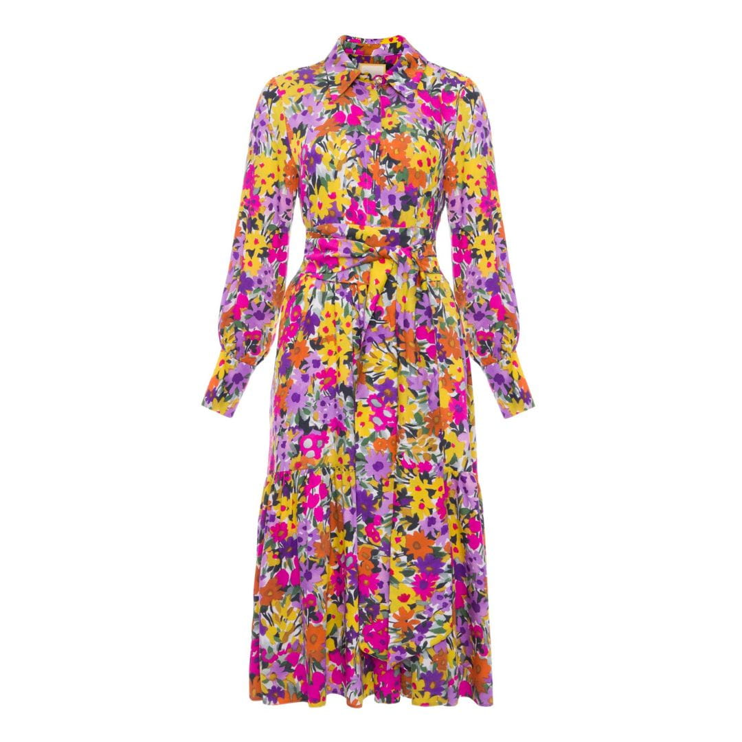 - Dress in a charming pattern- colorful in flowers, with predominantly pink