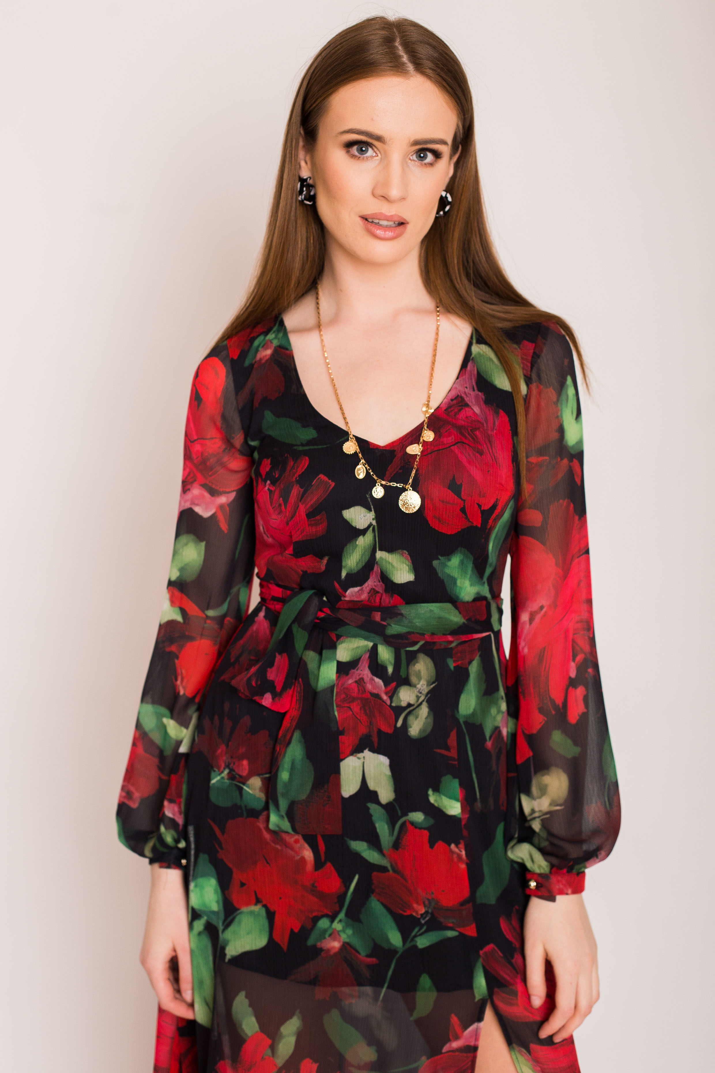 - Dress made of light, ethereal chiffon with red flowers on a black background