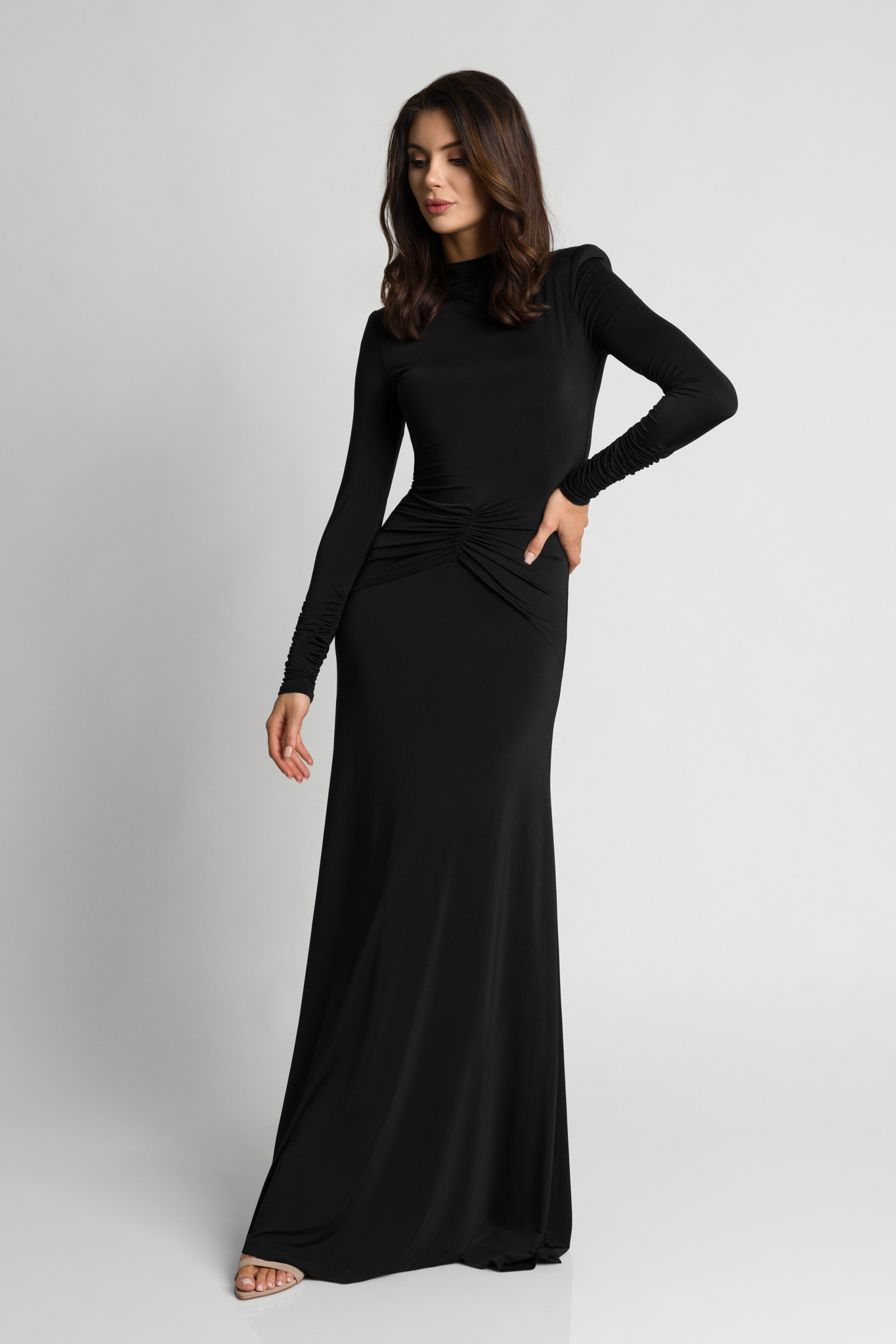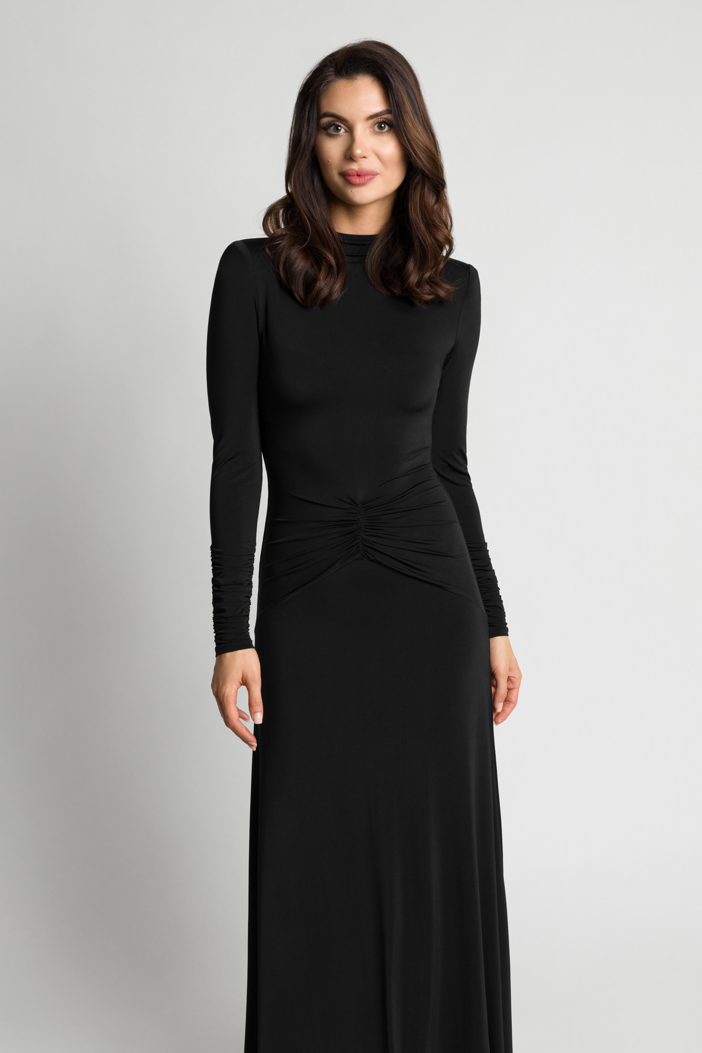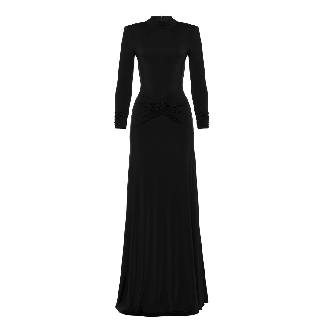 Długa efektowana czarna sukienka z marszczeniem w talii Anabel by Swing