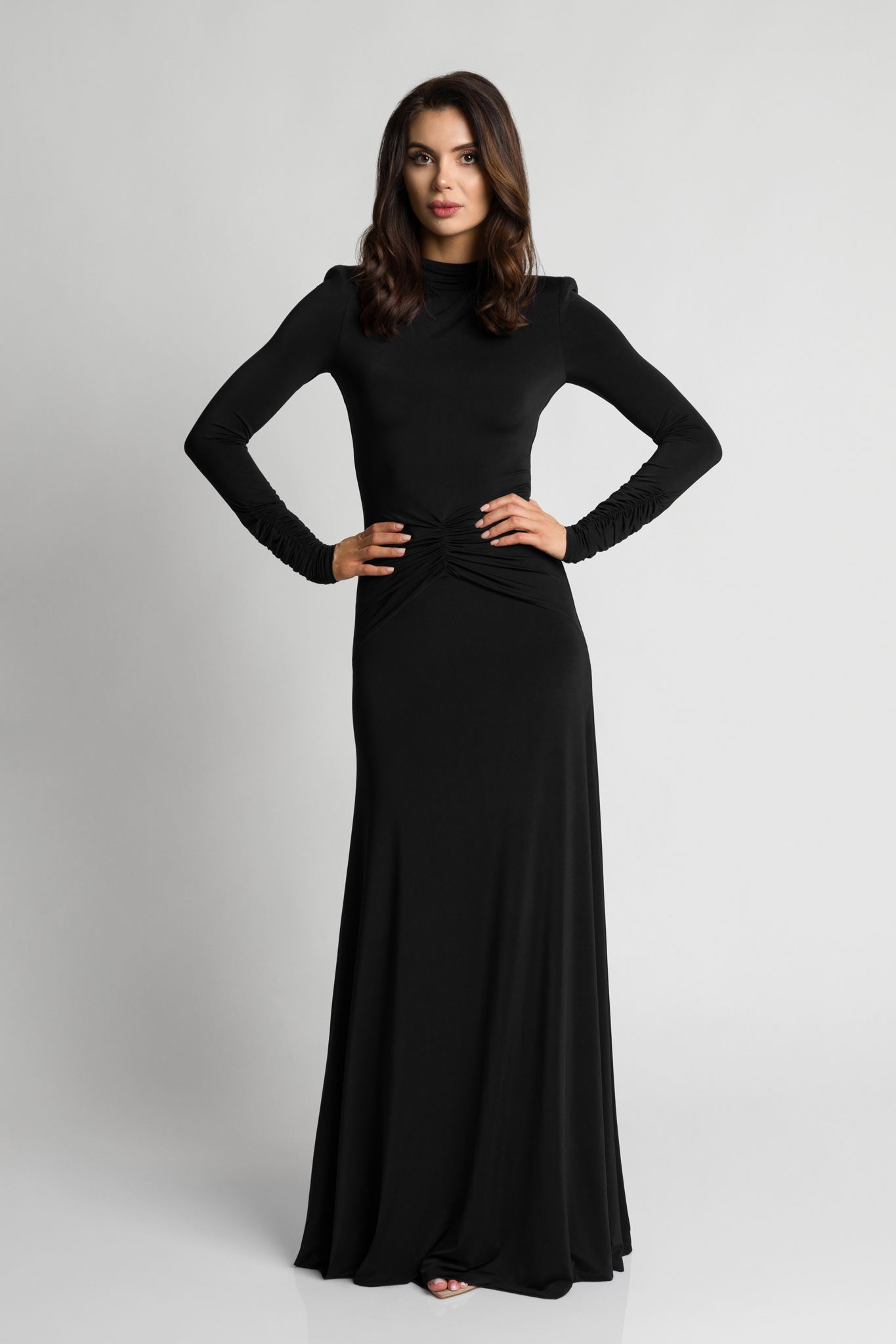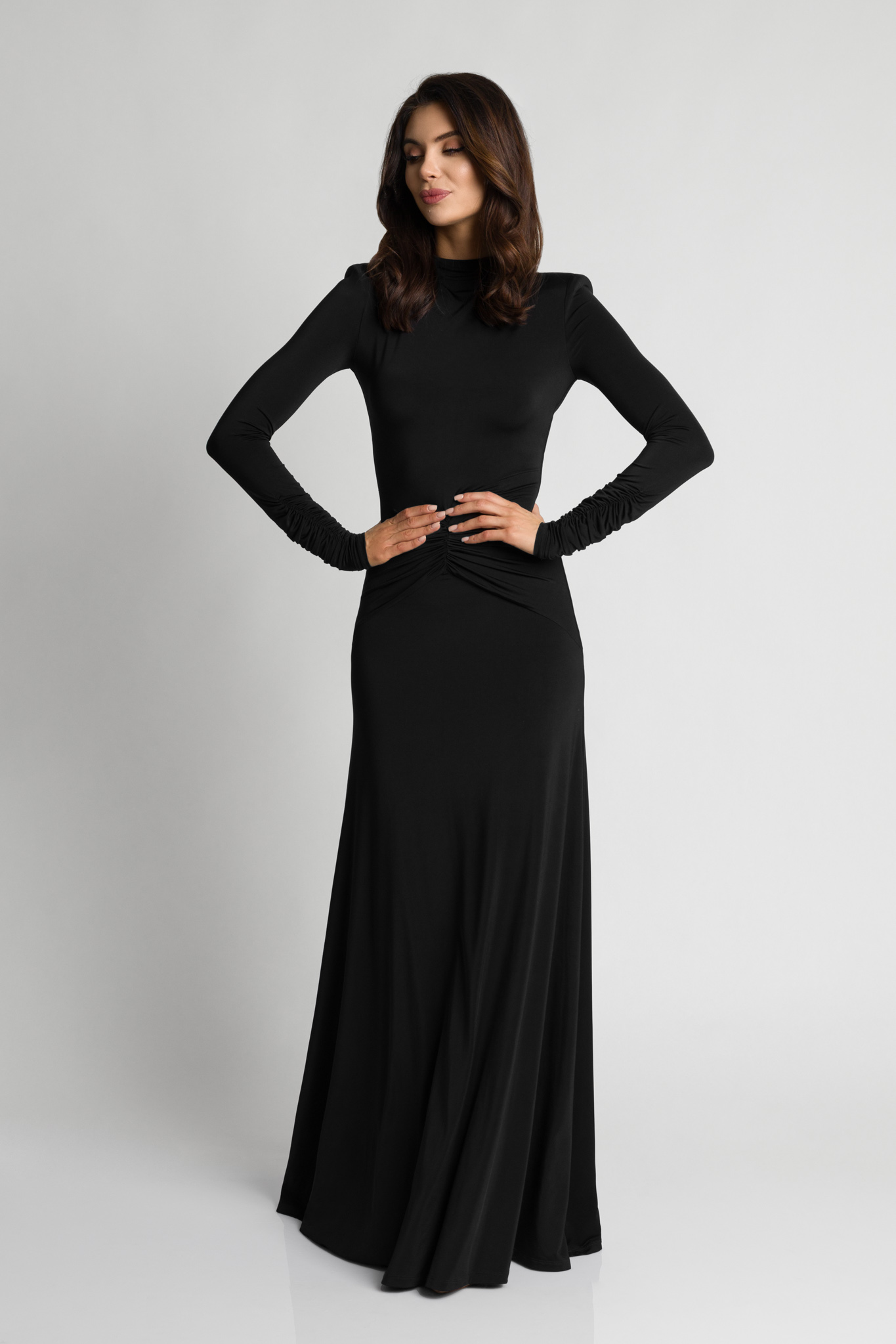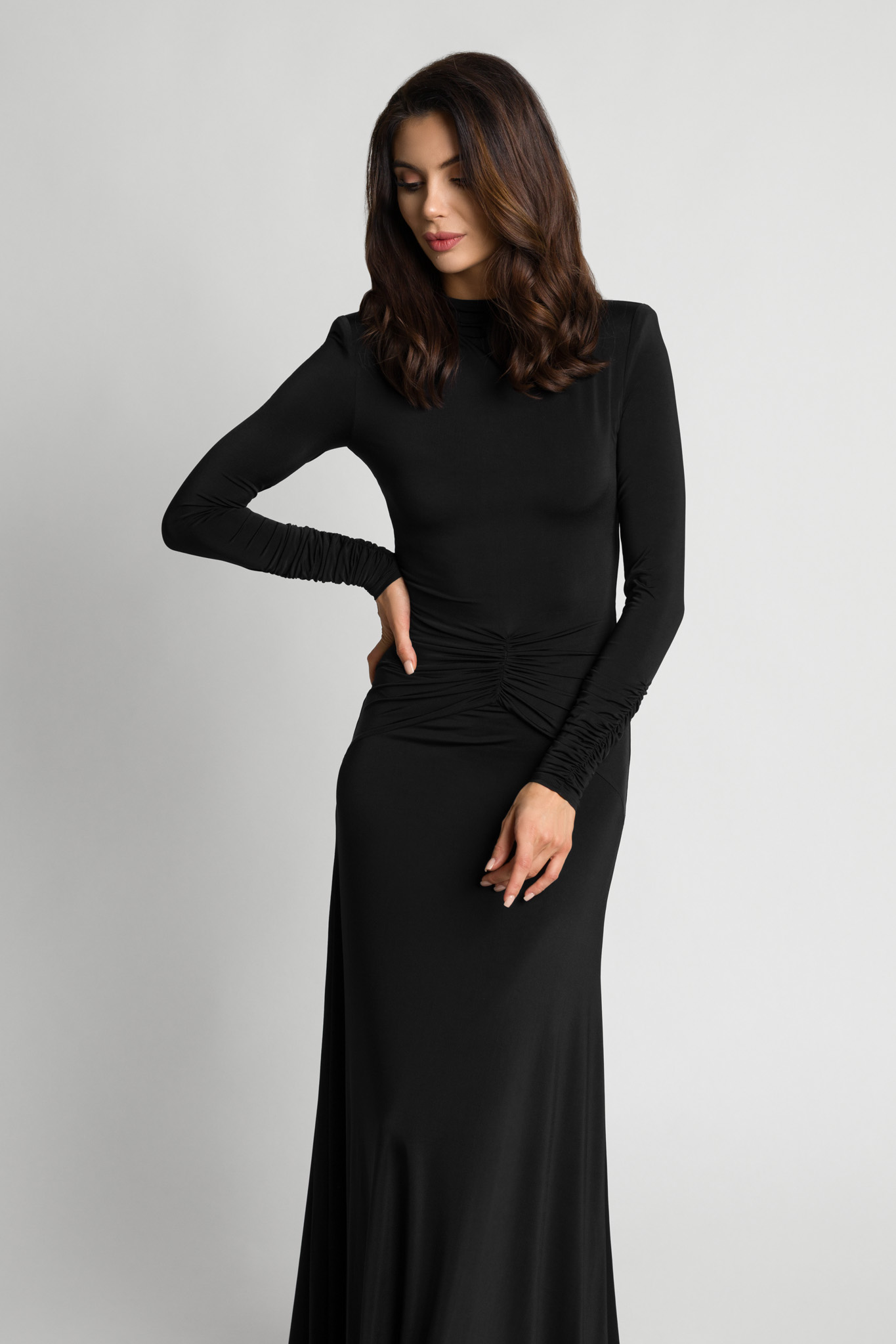 Długa efektowana czarna sukienka z marszczeniem w talii Anabel by Swing
