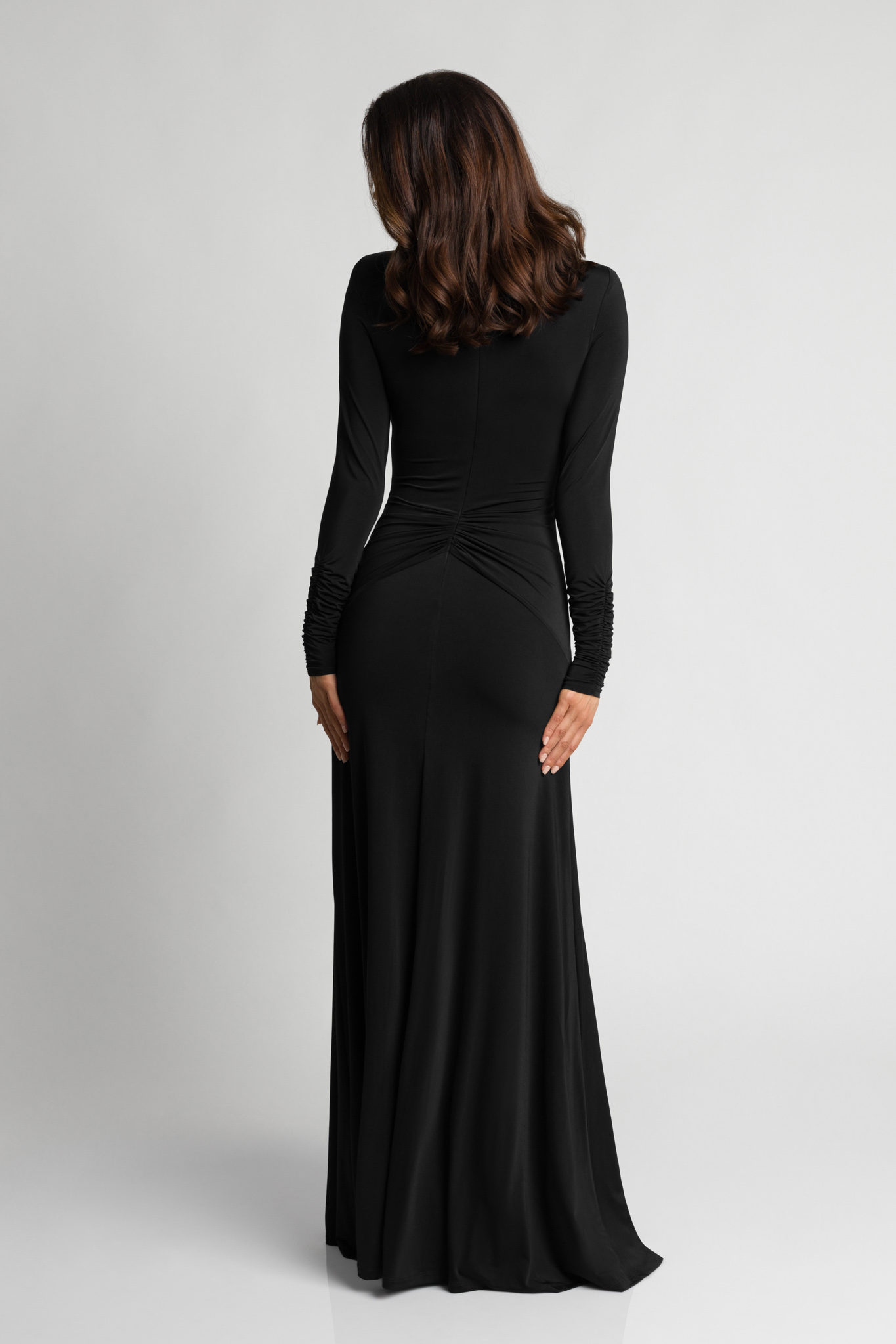- Tył sukienki posiada charakterystyczne marszczenie biegnące od linii talii ku środkowi placów podkreśla kształty, nadając sylwetce smukłości i proporcji