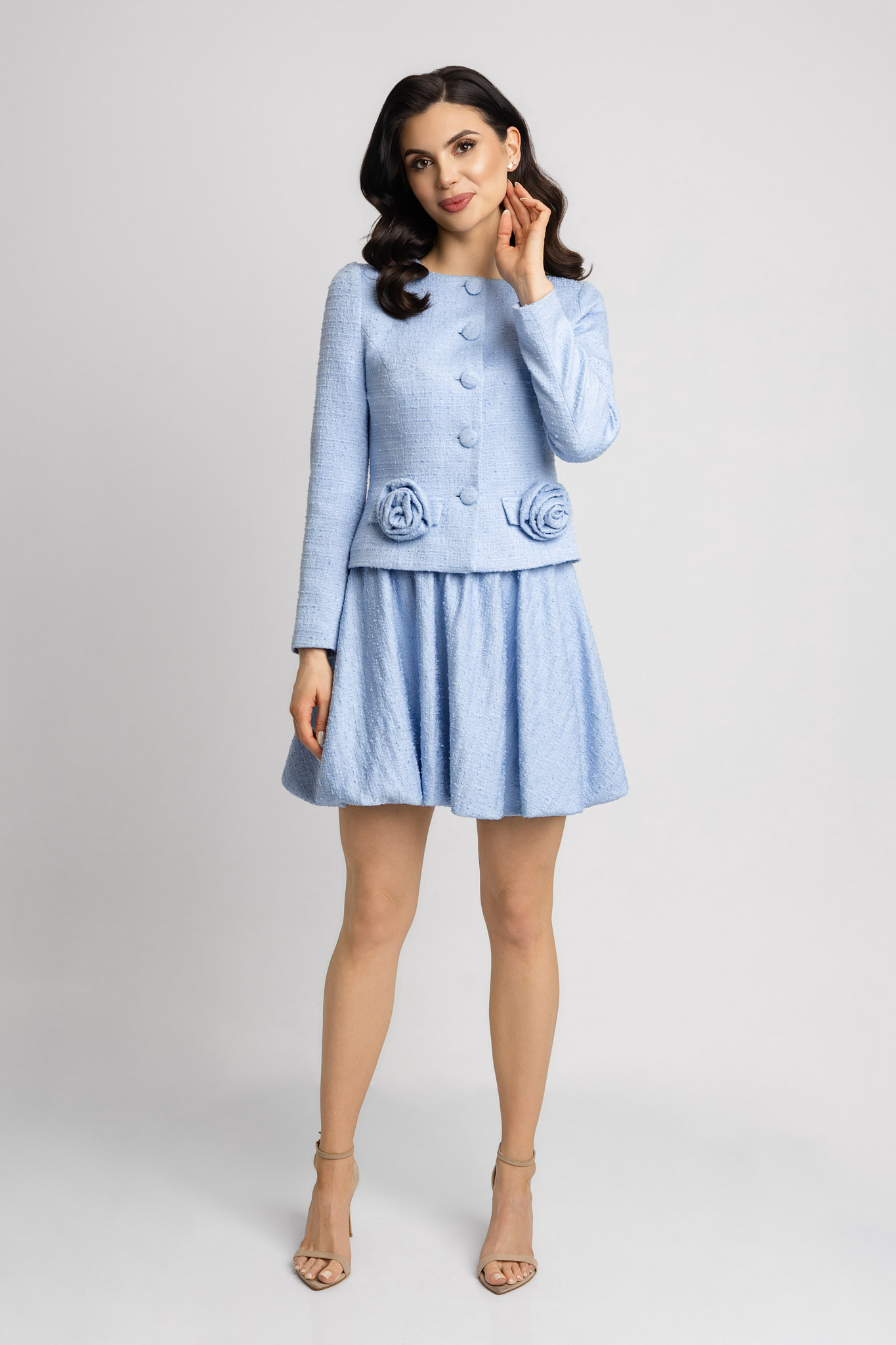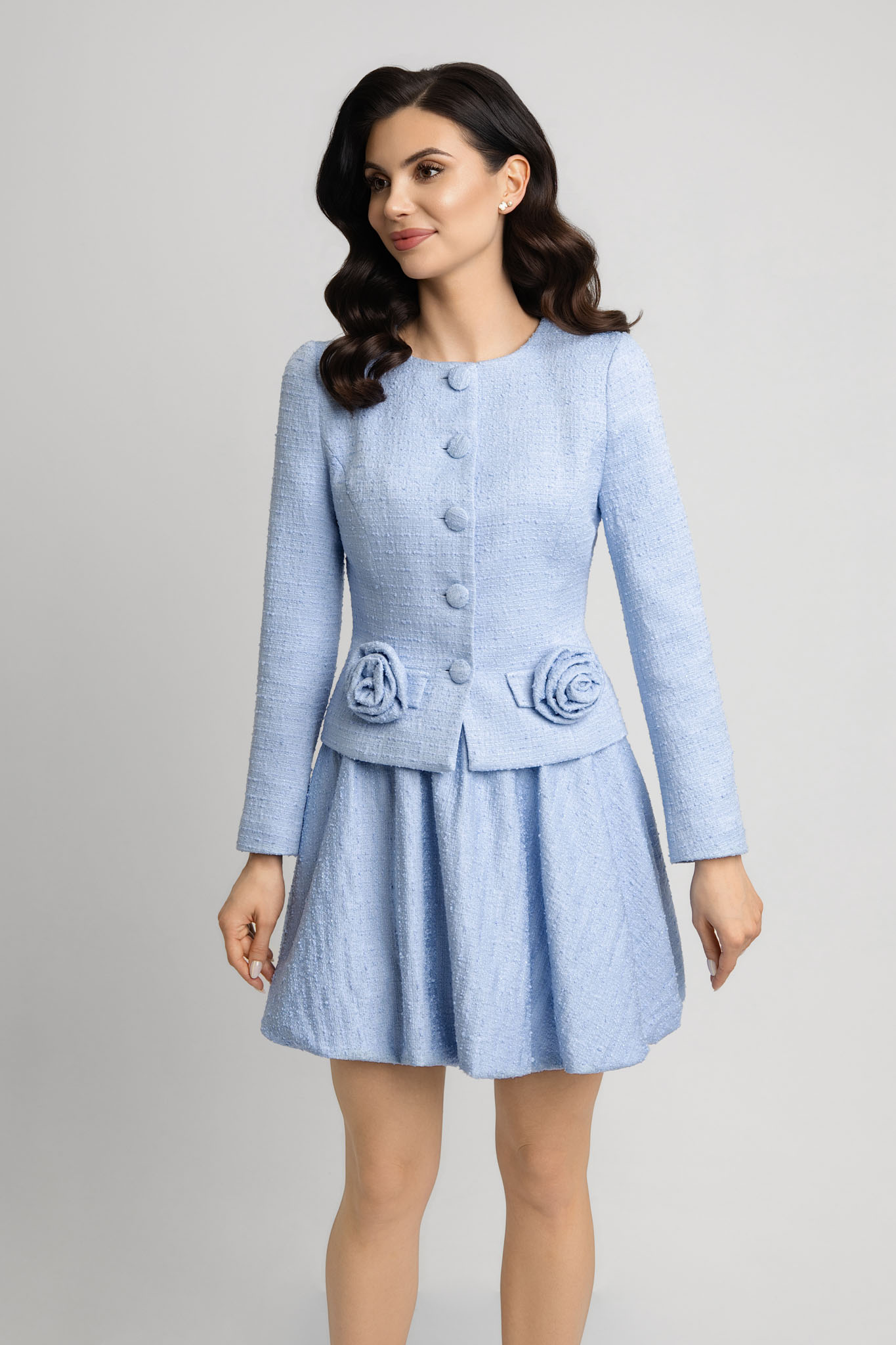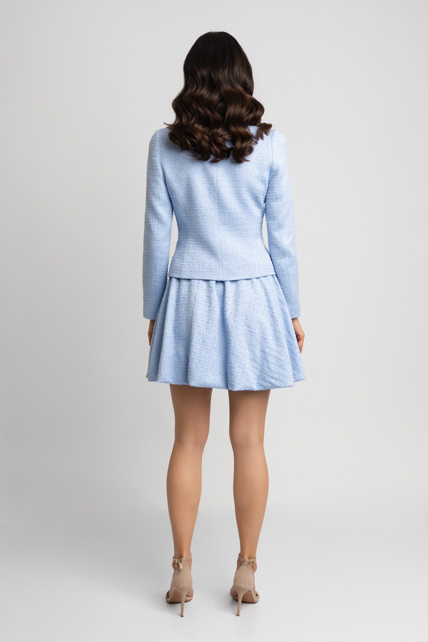 Błękitny tweedowy komplet spódnica+ marynarka z ozdobnymi kieszeniami Rosalie by Swing baby blue