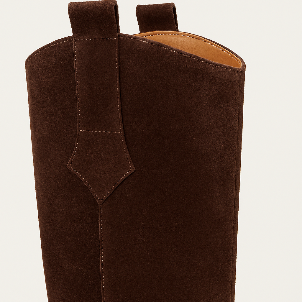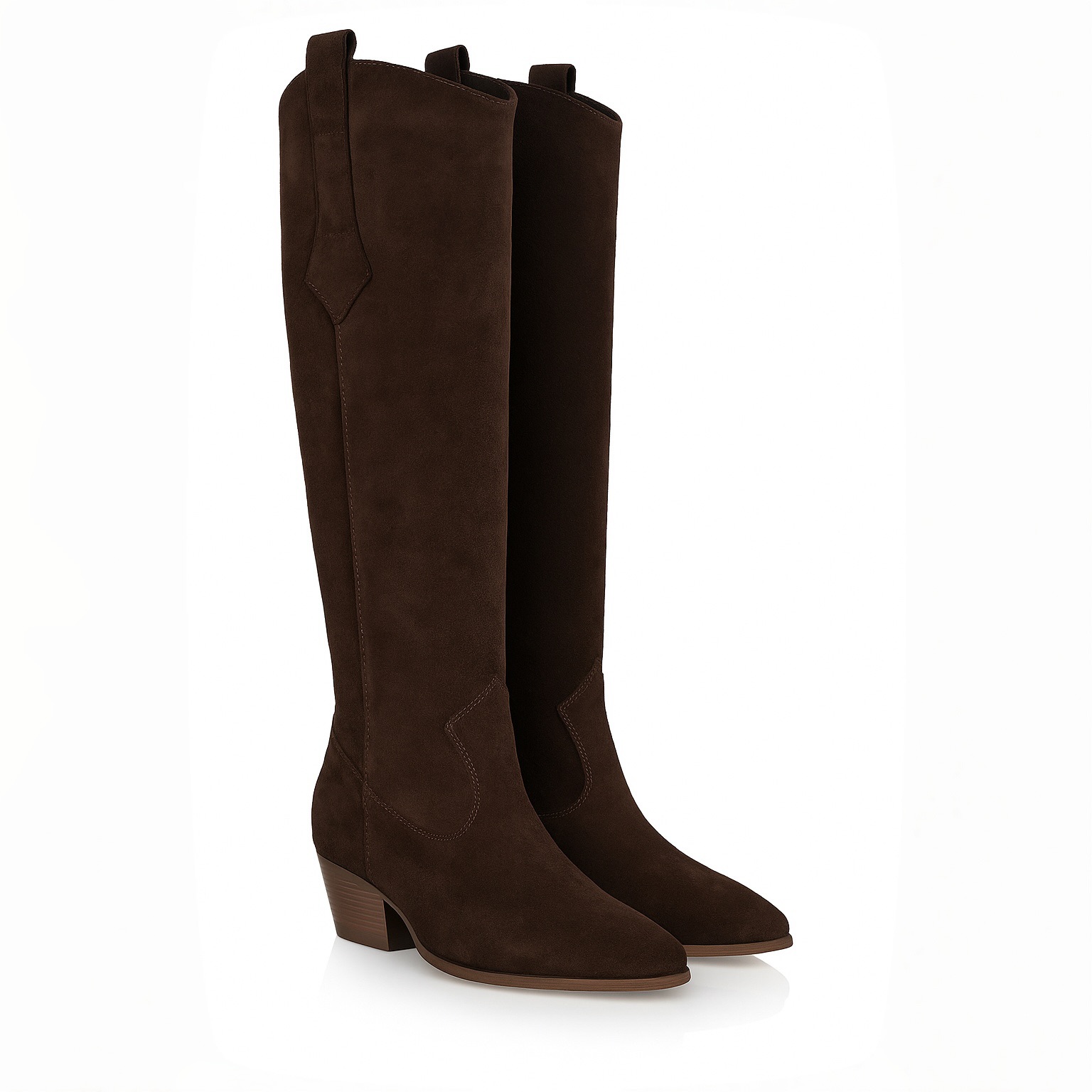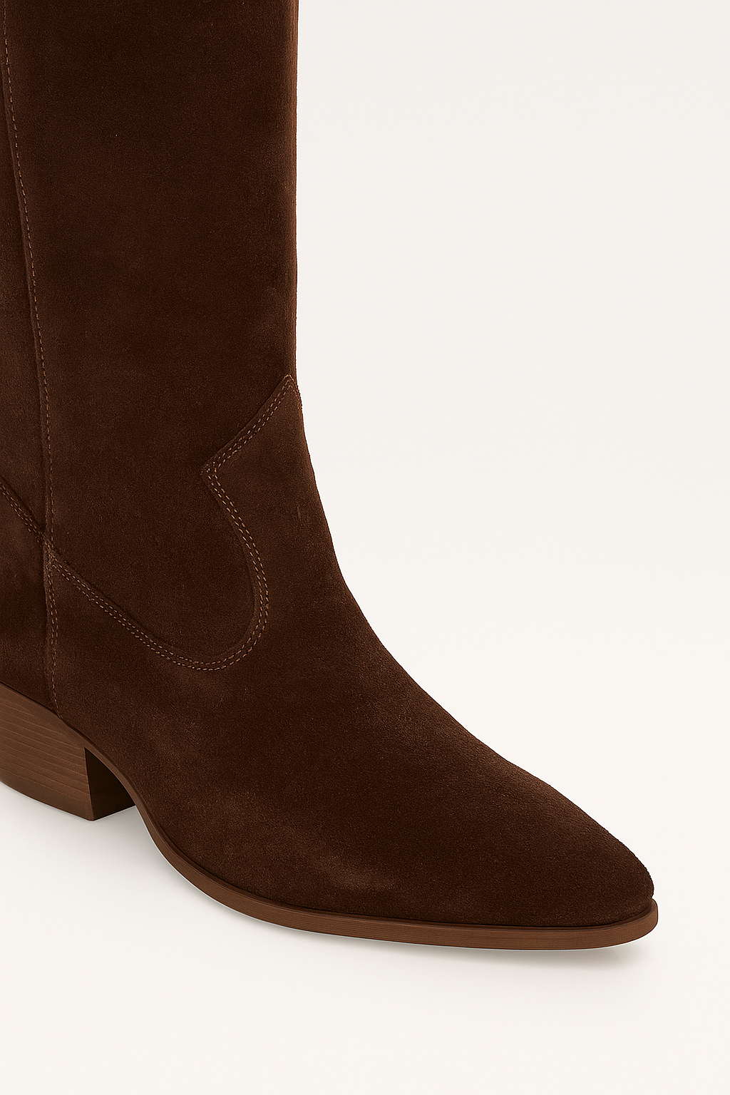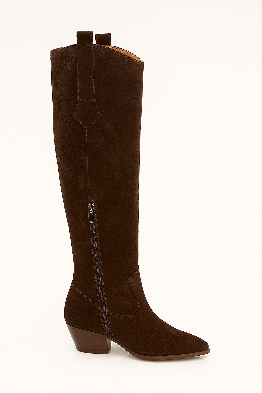 Brązowe zamszowe skórzane kozaki kowbojki przed kolano