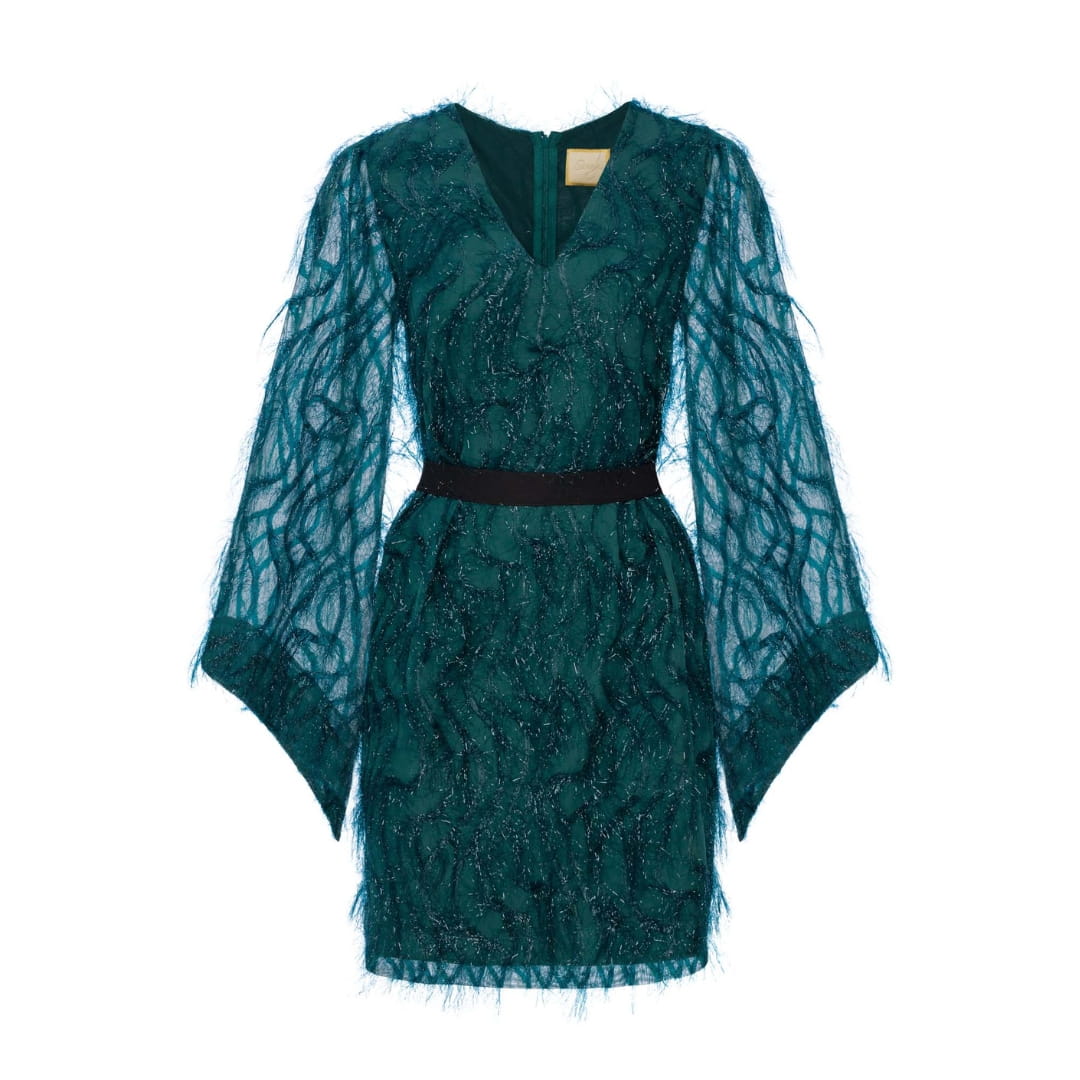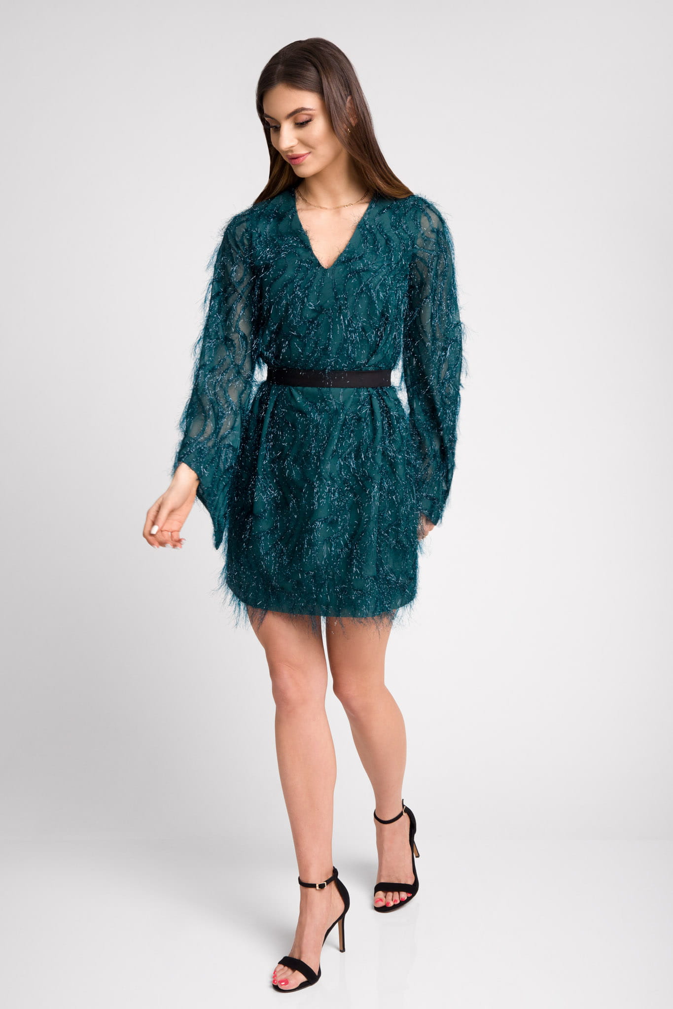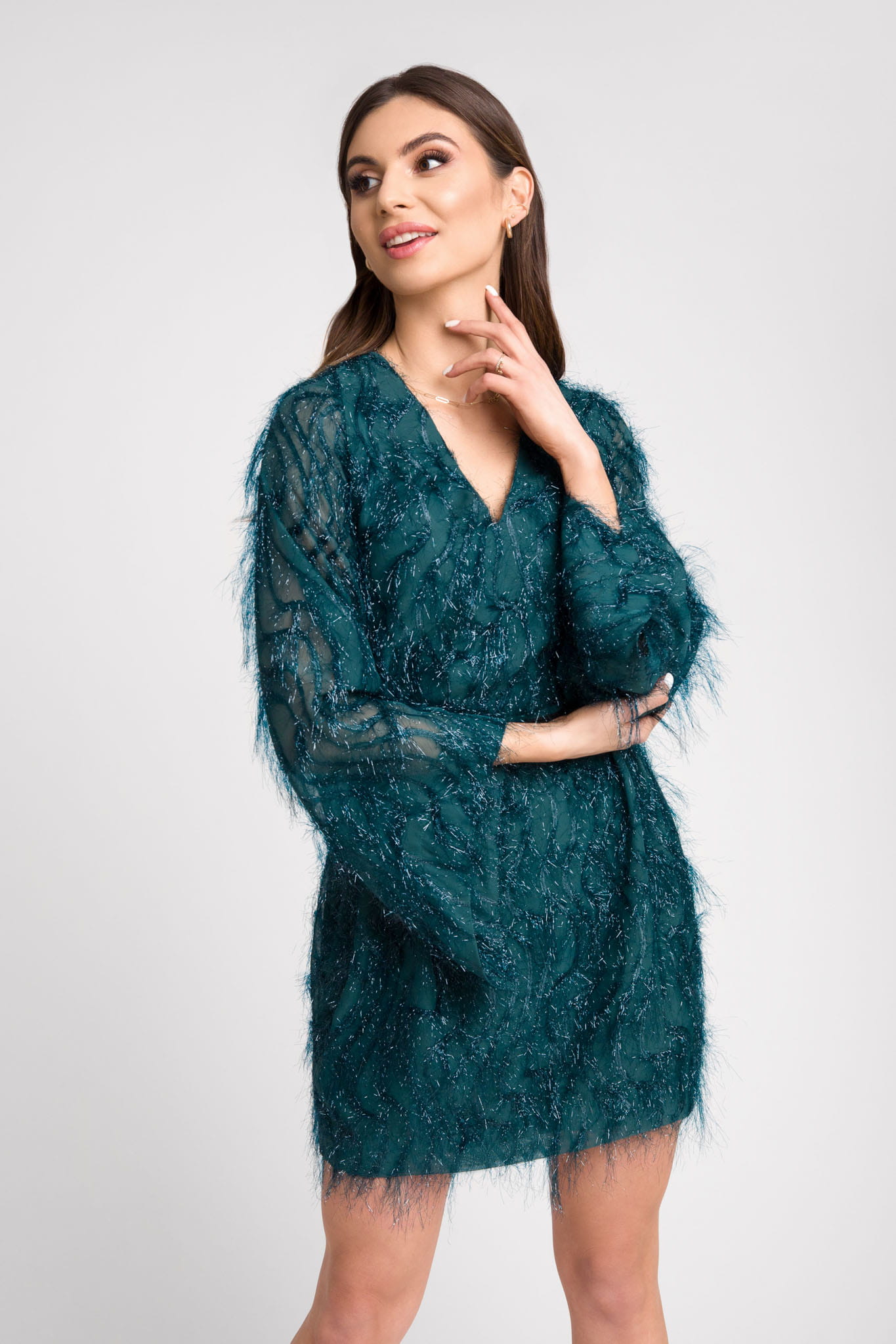- Sukienka i pióra w kolorze butelkowej zieleni z połyskującą nitką