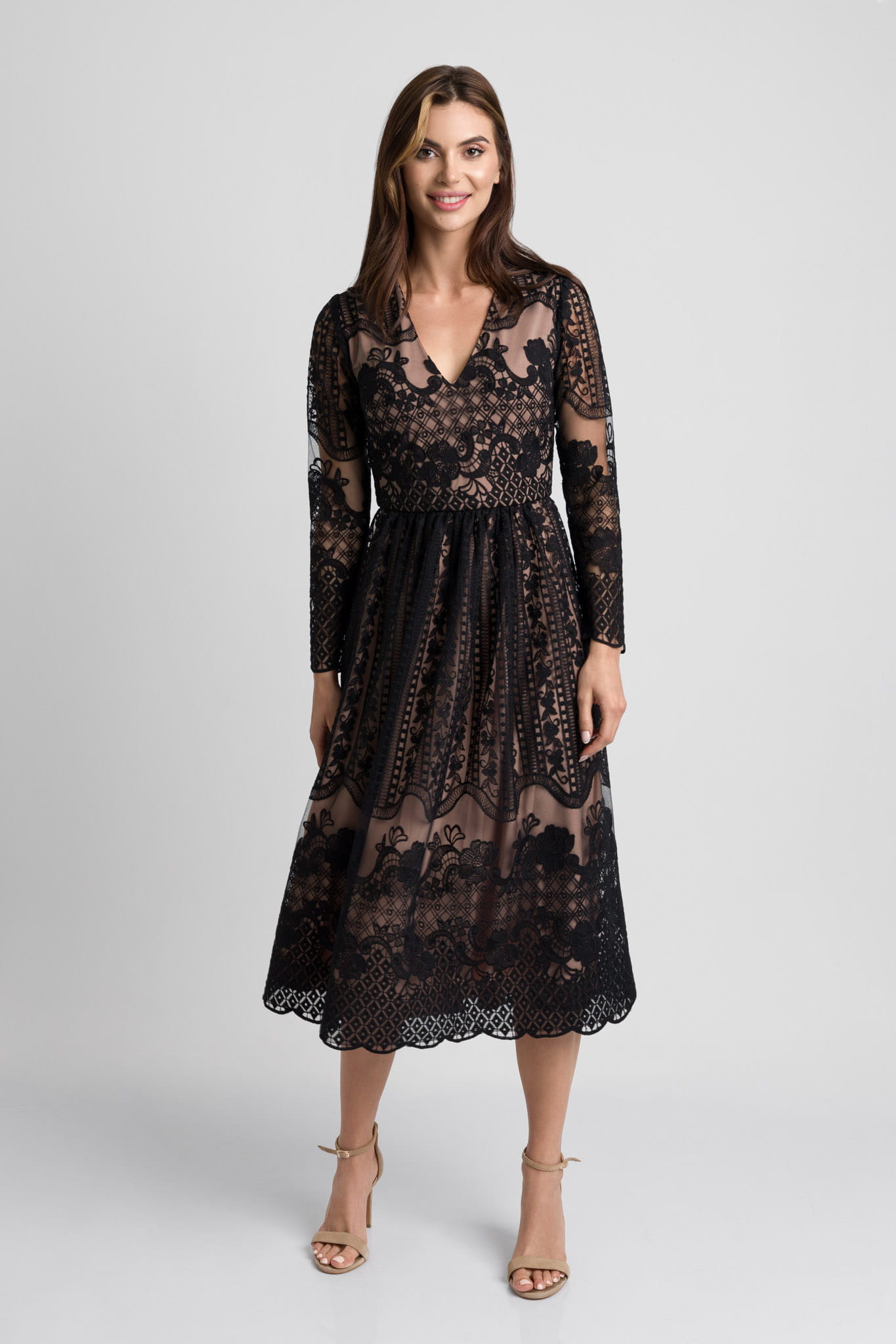 Czarna koronkowa rozkloszowana sukienka midi z dekoltem Gracia by Swing