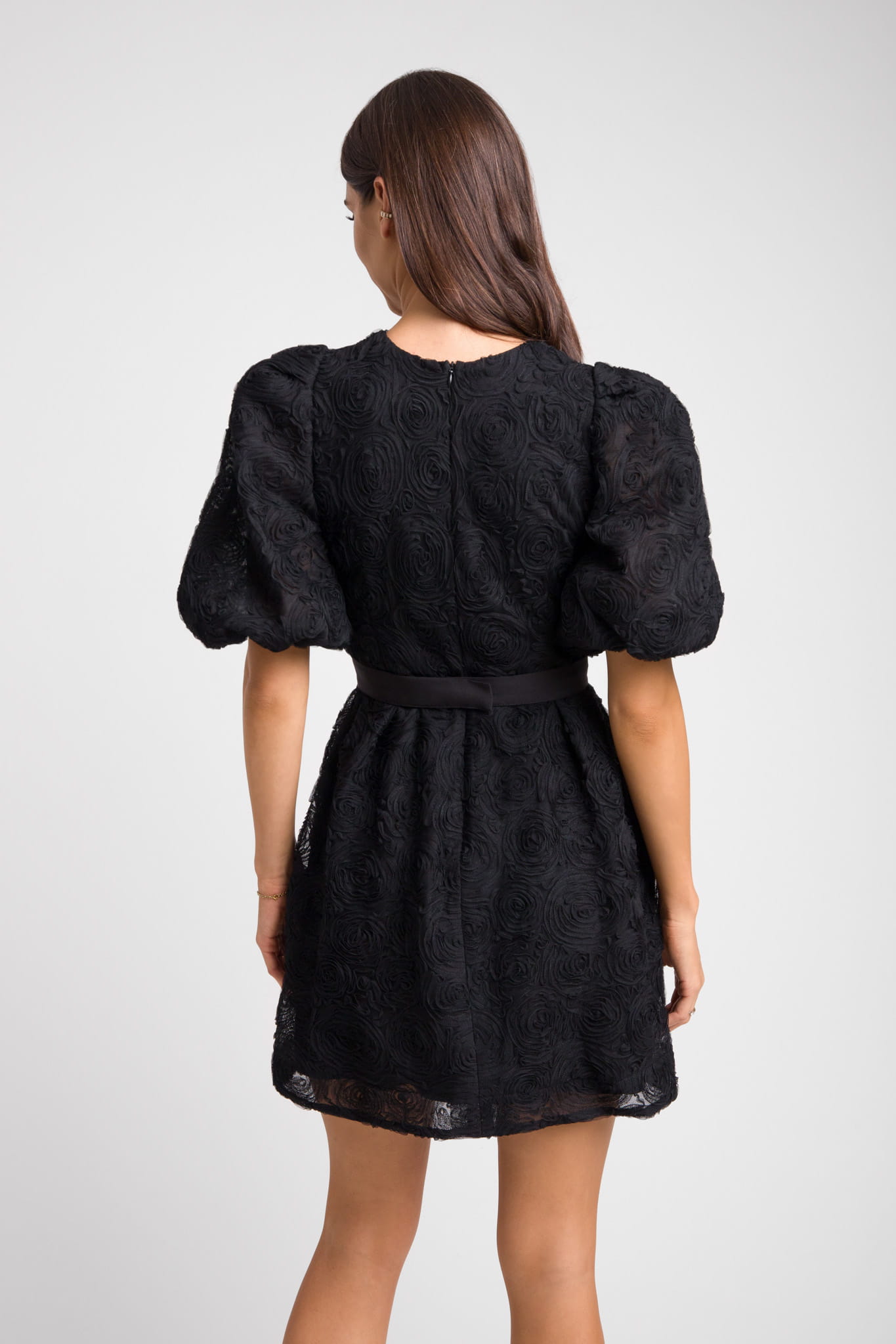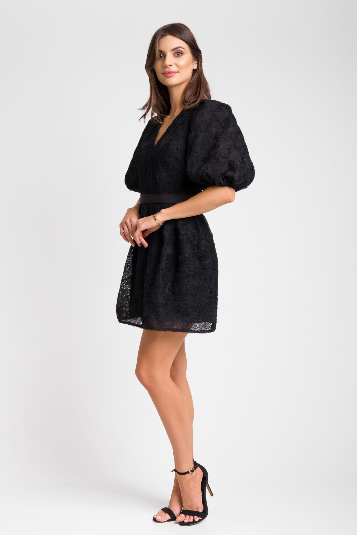 Czarna tiulowa lekko rozkloszowana sukienka mini z bufiastym rękawem w róże Nadine by Swing