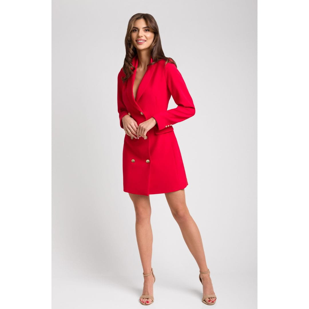 Czerwona elegancka sukienka o kroju marynarki ze złotymi guzikami CORA by Swing