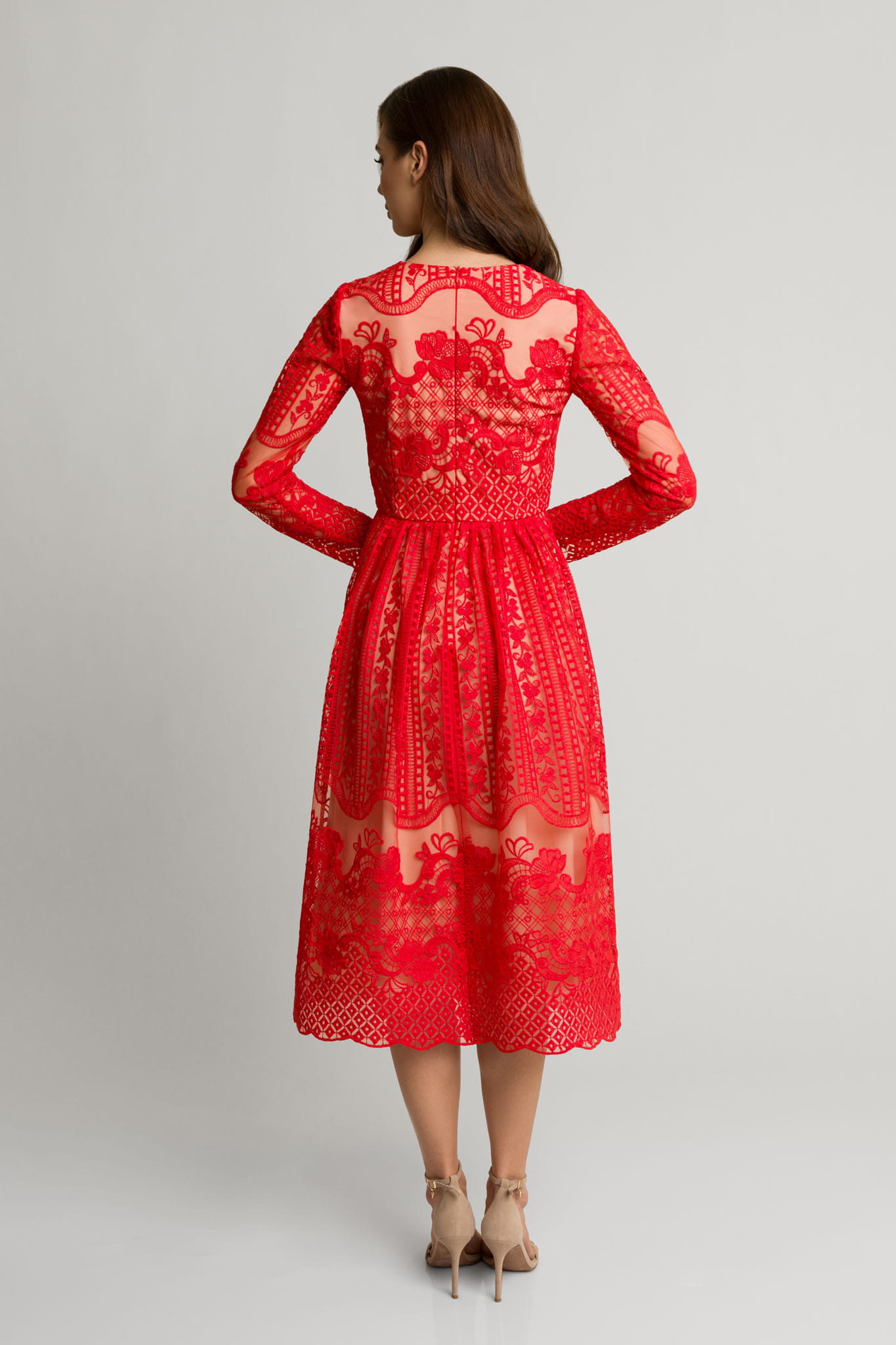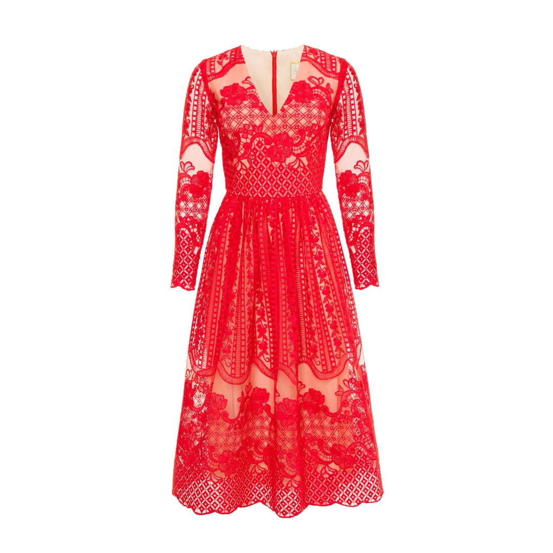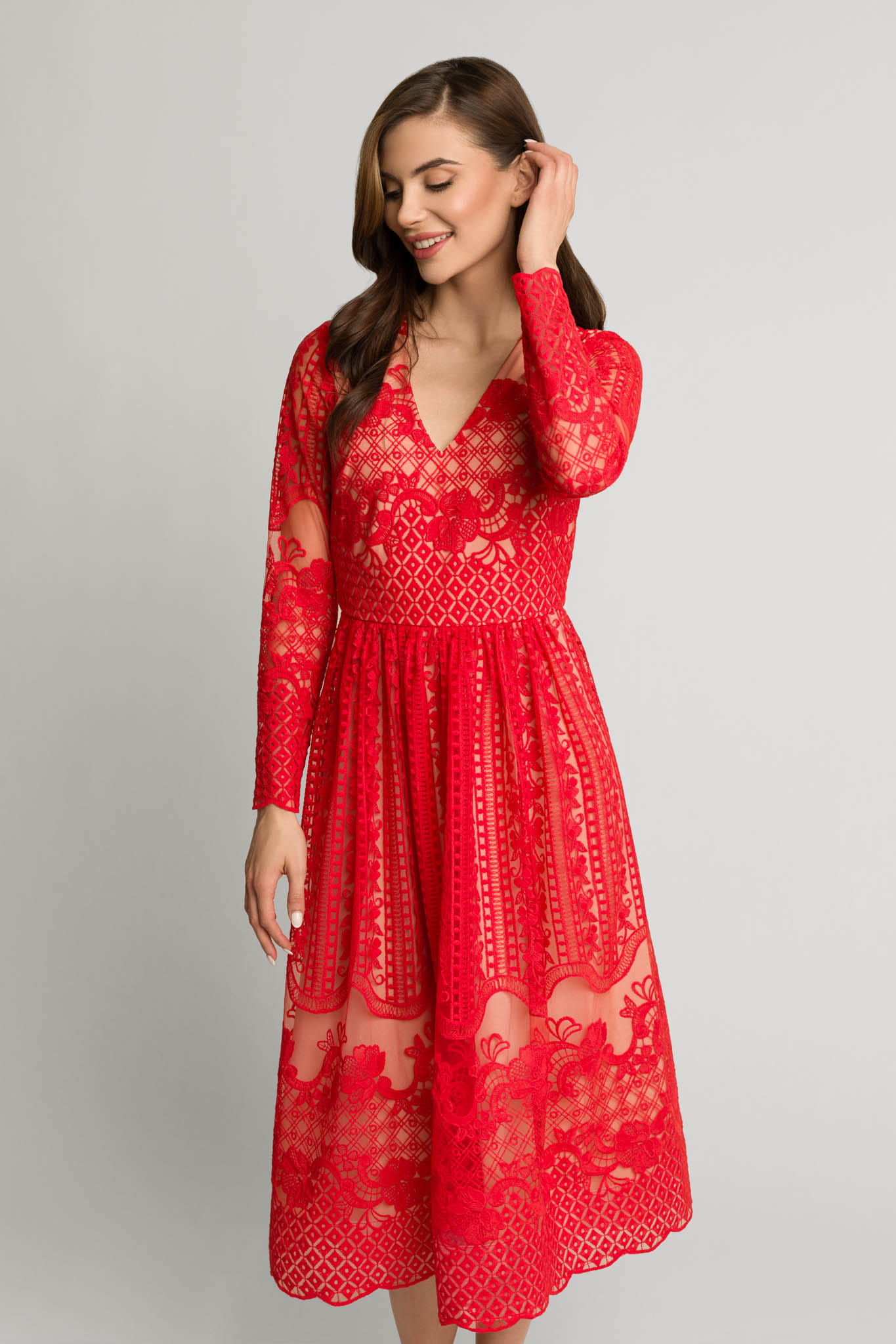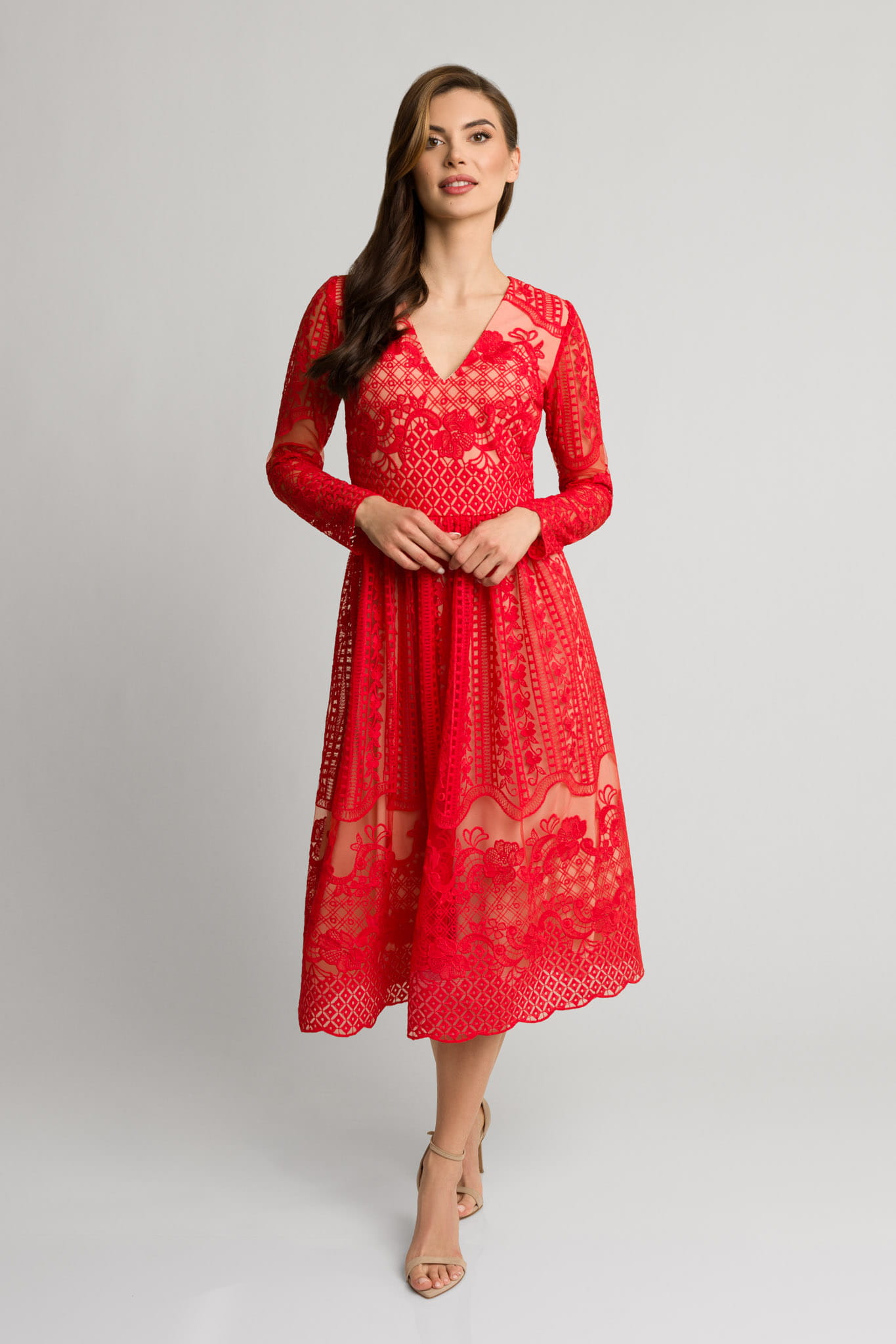 Czerwona koronkowa rozkloszowana sukienka midi z dekoltem Gracia by Swing