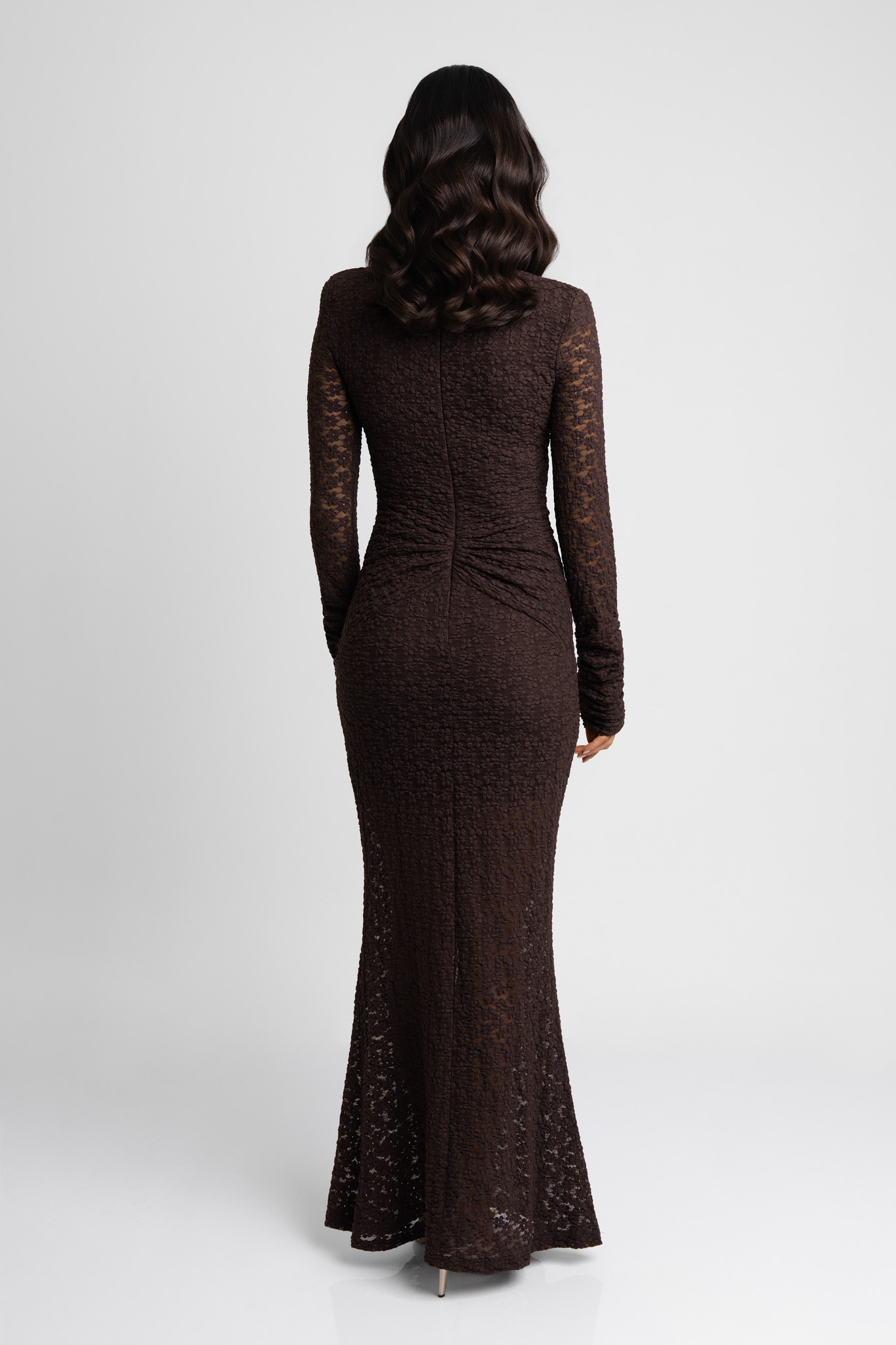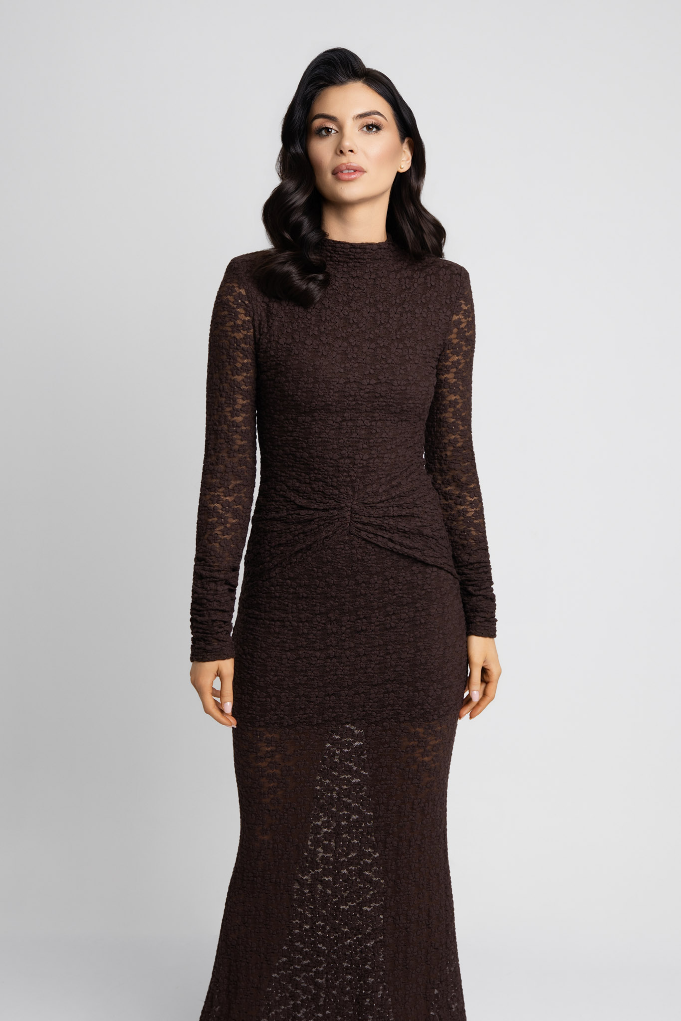 Długa dopasowana koronkowa sukienka brąz Anabel romantic by Swing