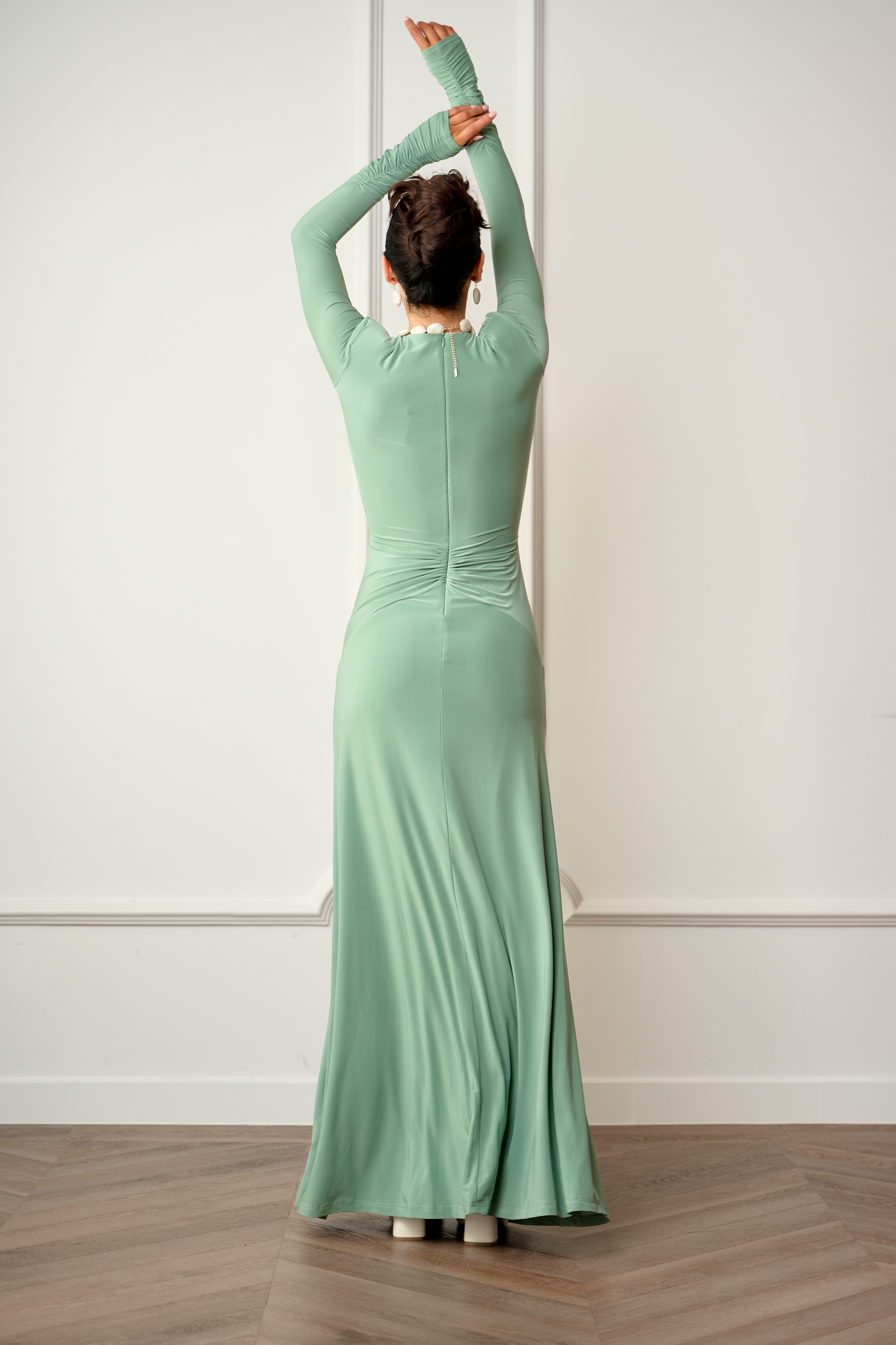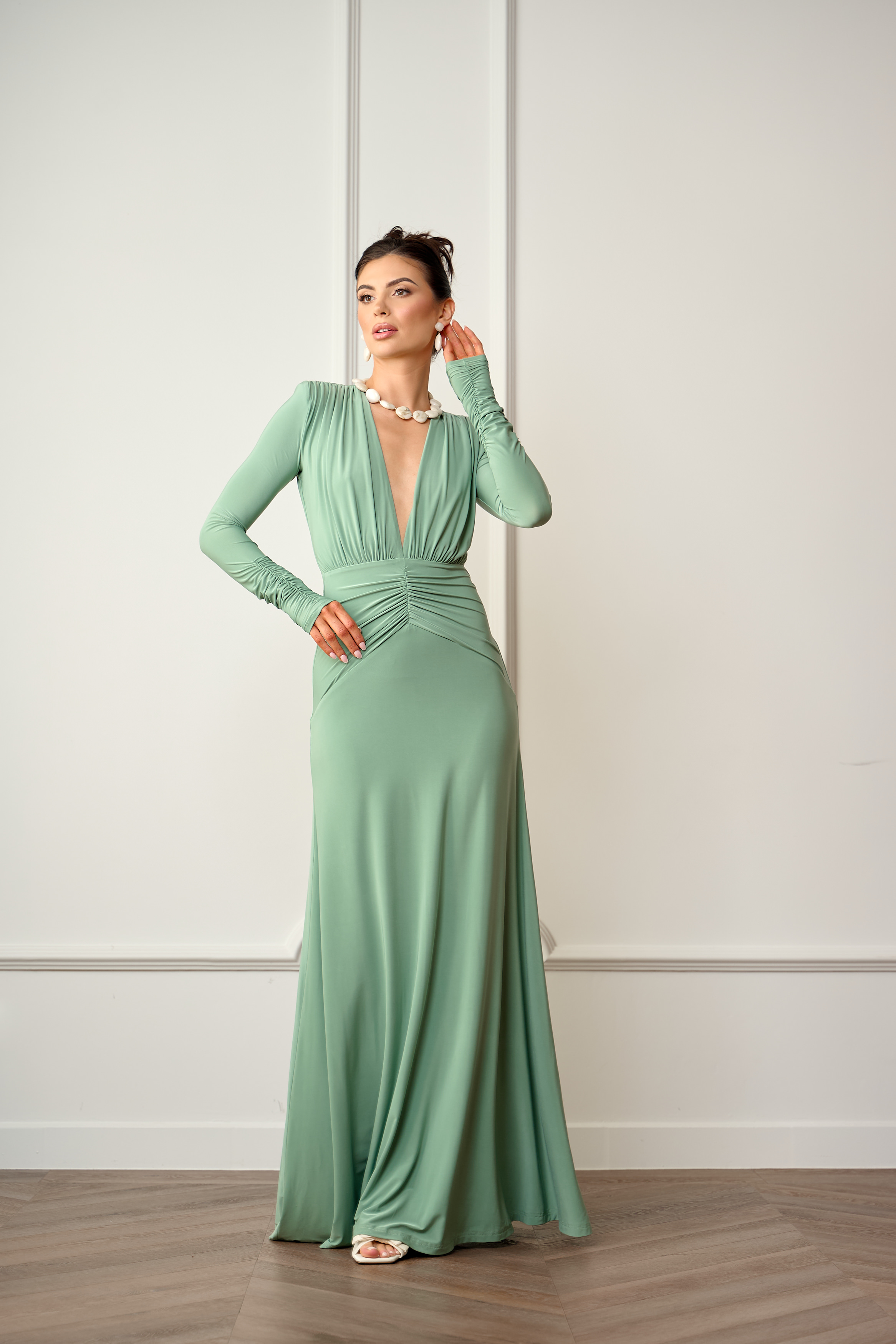 Długa efektowana miętowa sukienka z głębokim dekoltem i marszczeniem w talii Valentina by Swing macha