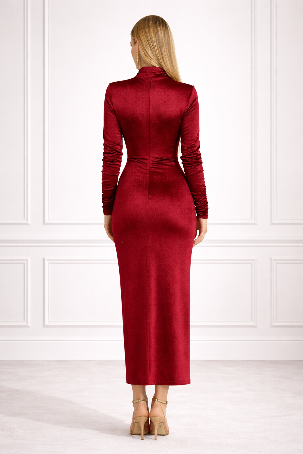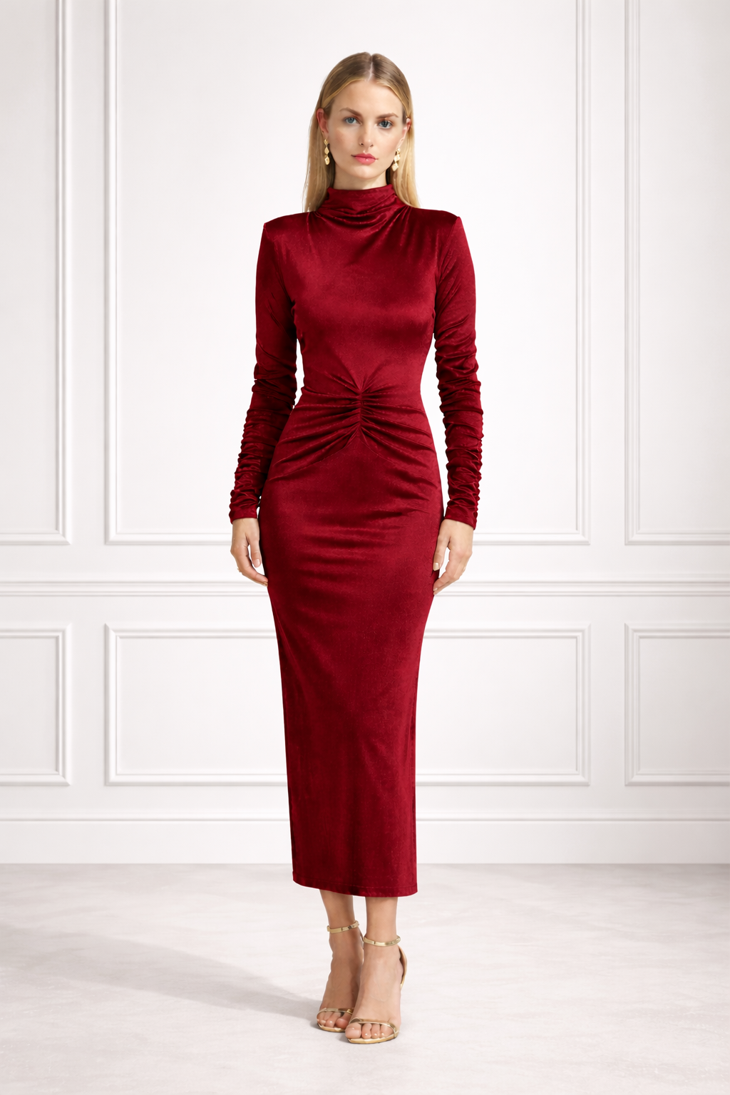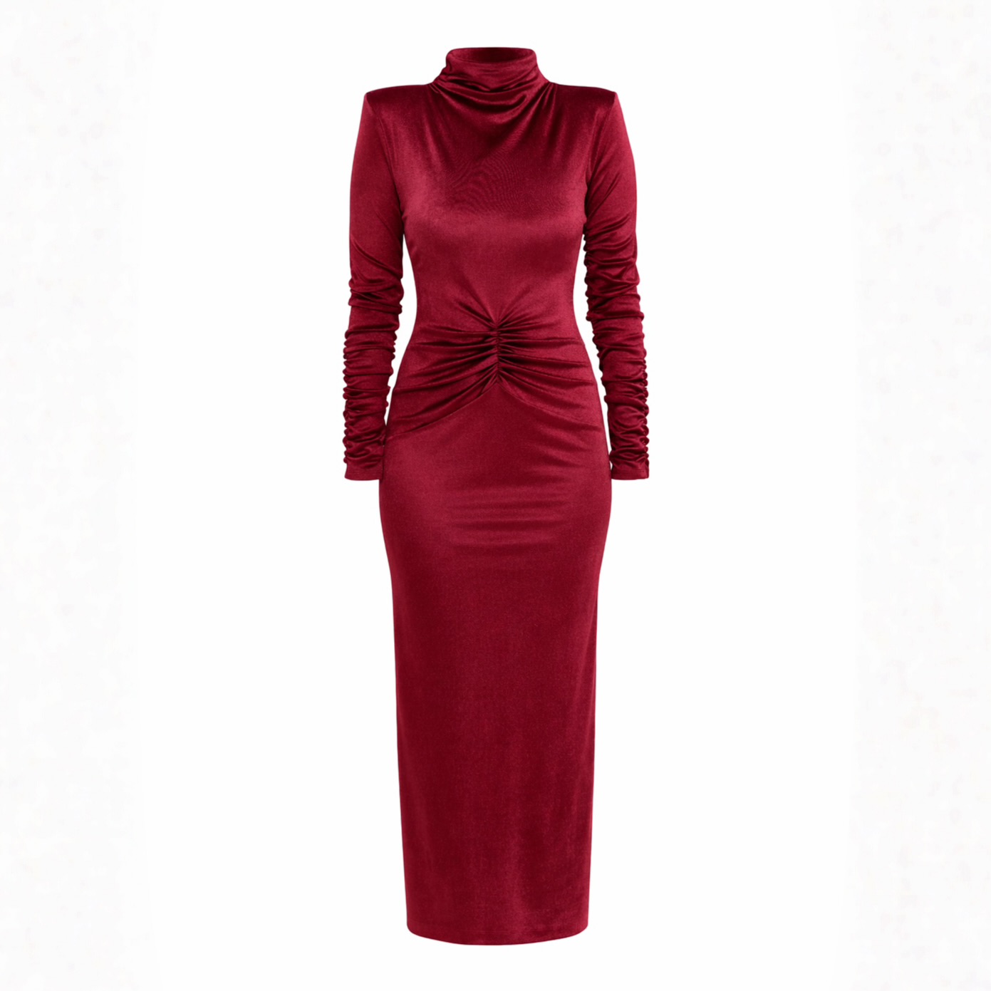 Dopasowana bordowa welurowa sukienka midi z półgolfem i ozdobnym marszczeniem Vera by Swing