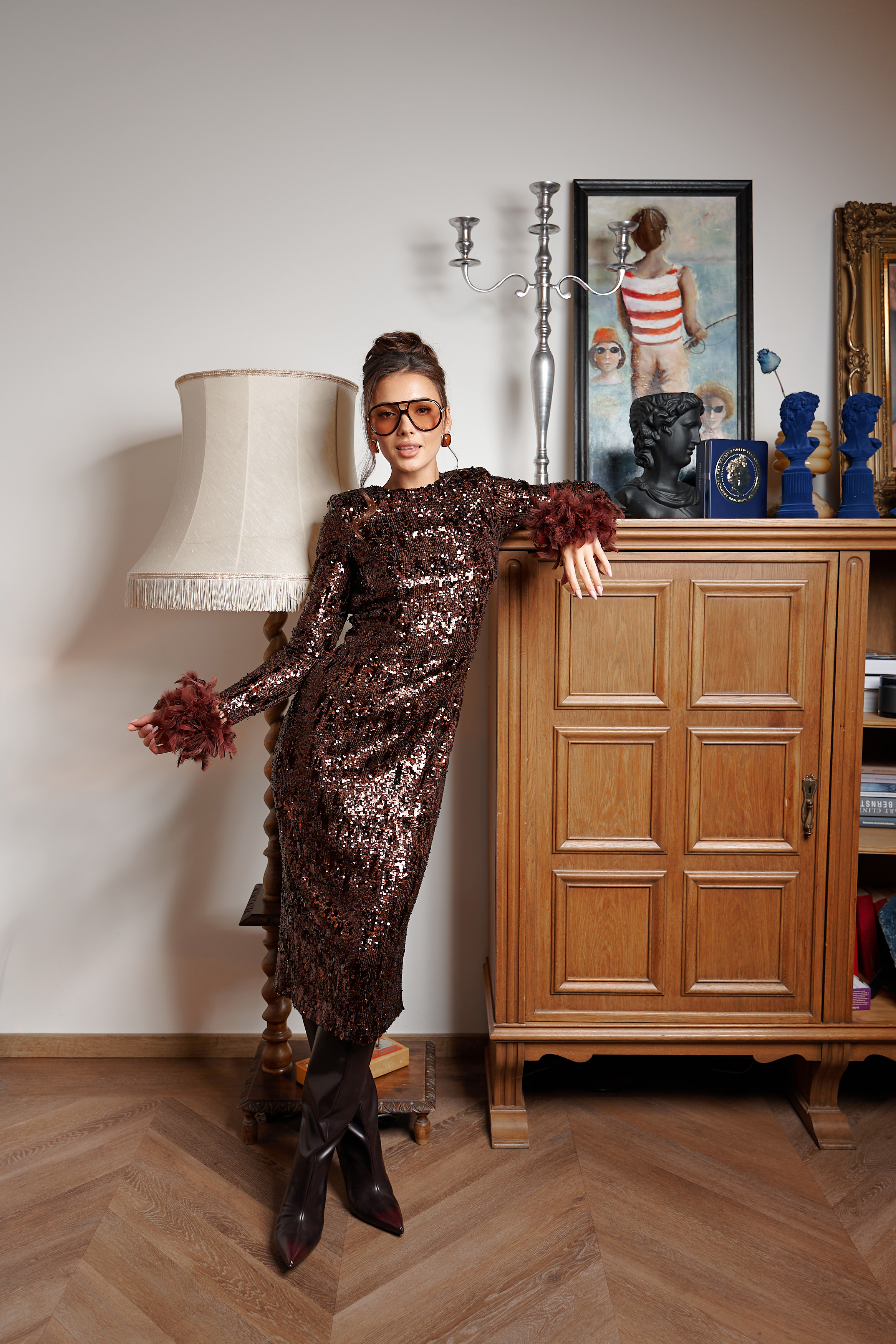 Dopasowana sukienka Pam z brązowych cekinów z długim rękawem wykończonym piórkami