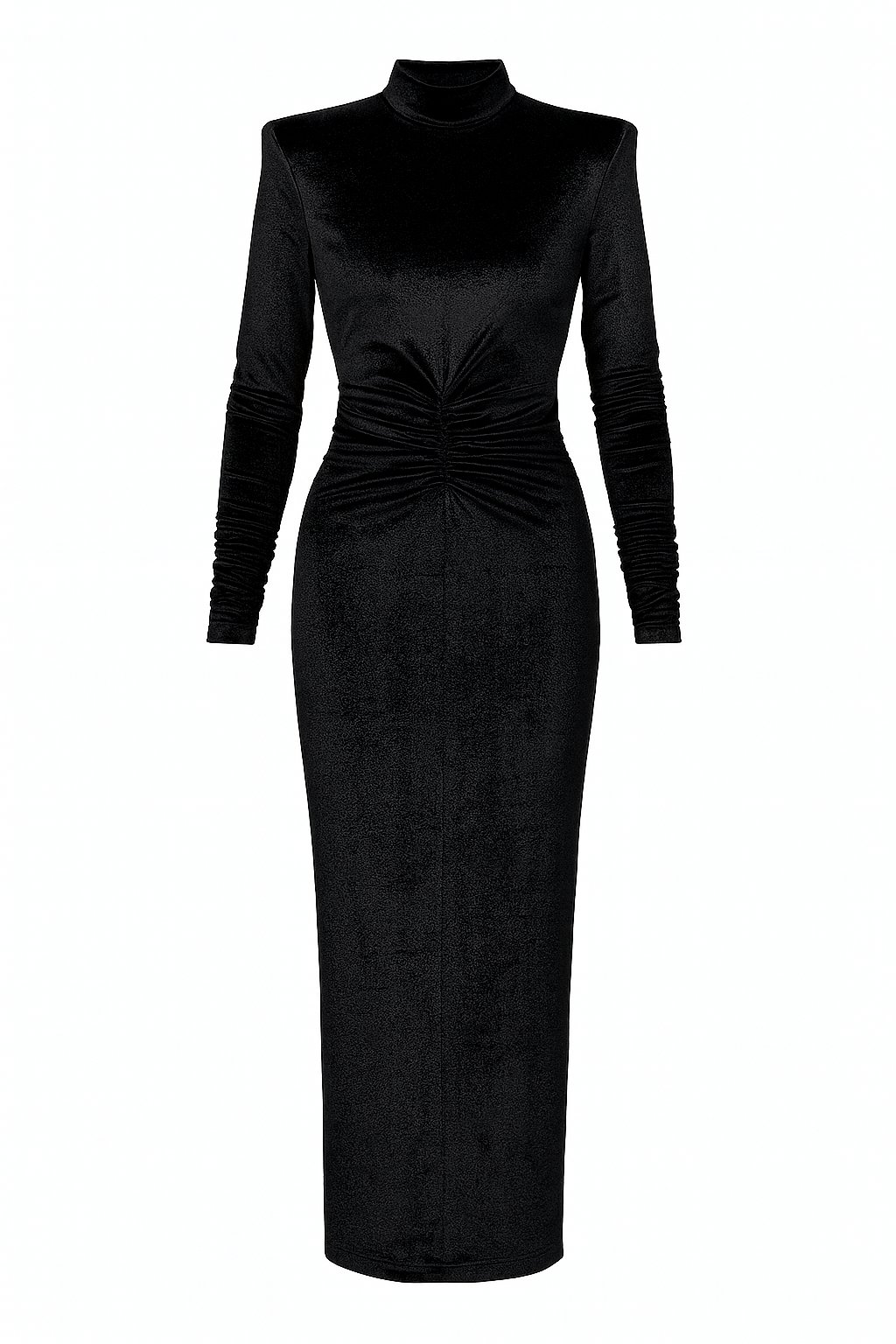 Dopasowana welurowa sukienka midi z półgolfem i ozdobnym marszczeniem Vera by Swing