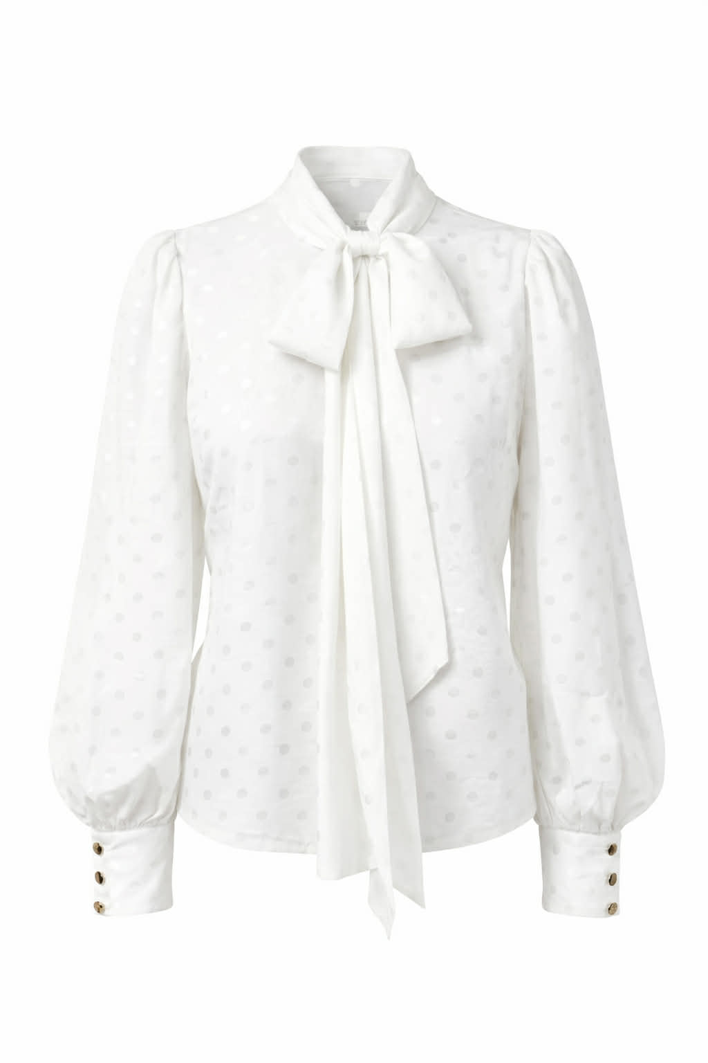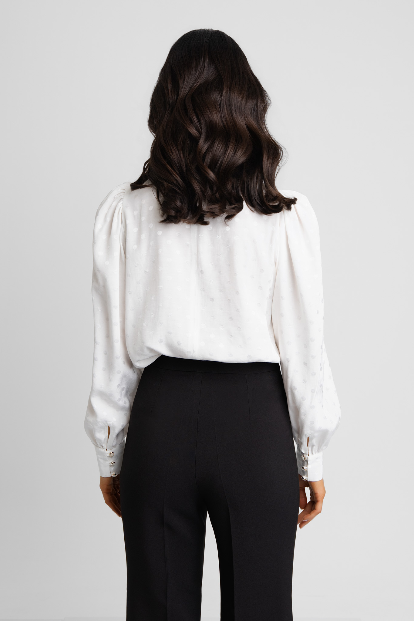 Elegancka wiskozowa biała koszula w delikatne grochy z wiązaniem przy szyi Mila by Swing