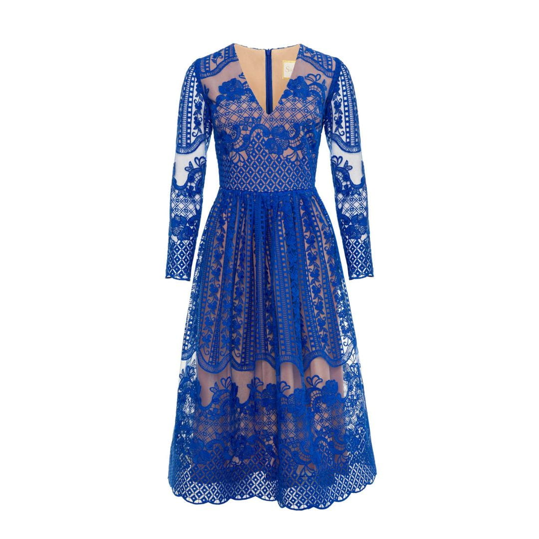 - Klasyczna koktajlowa sukienka wykonana z pięknej koronki w eleganckim kobaltowym kolorze