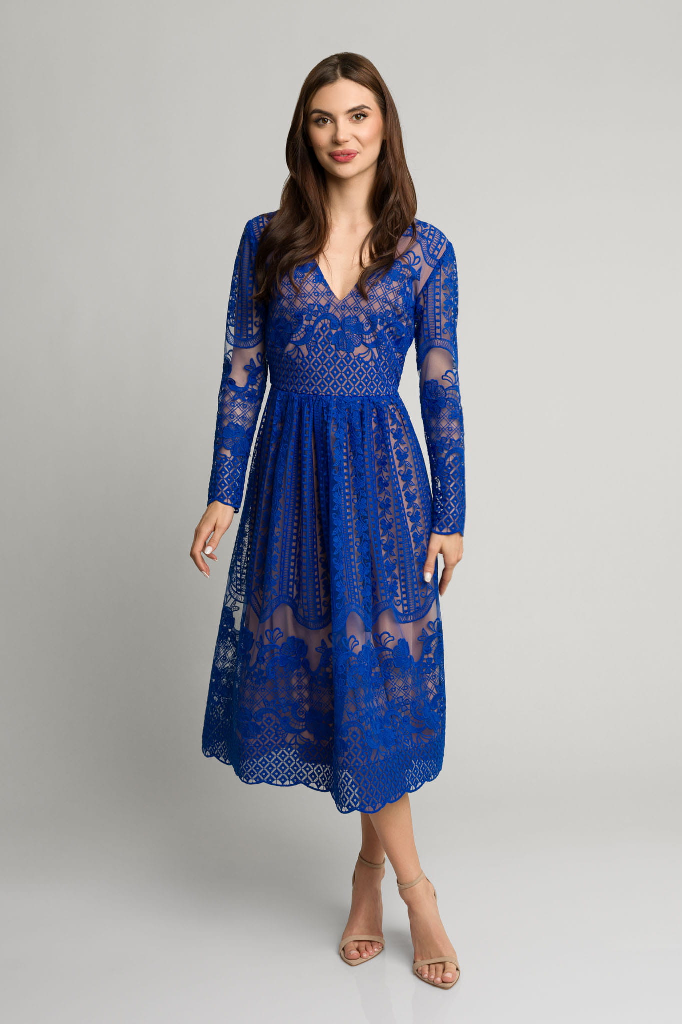 Kobaltowa koronkowa rozkloszowana sukienka midi z dekoltem Gracia by Swing