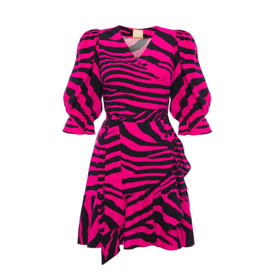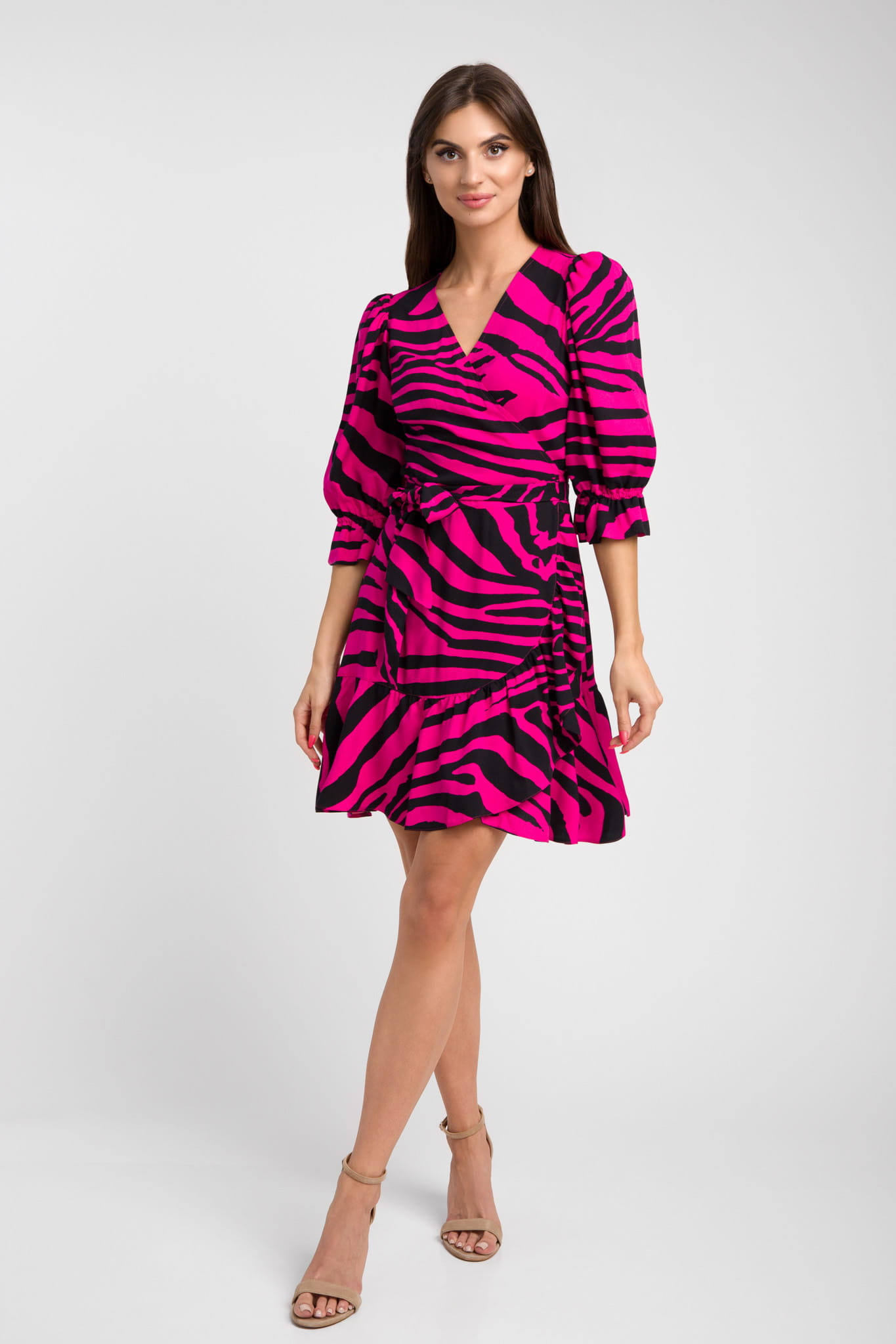 Kopertowa fuksjowa sukienka w zebrę z bufiastymi rękawkami i falbankami Sophia by Swing
