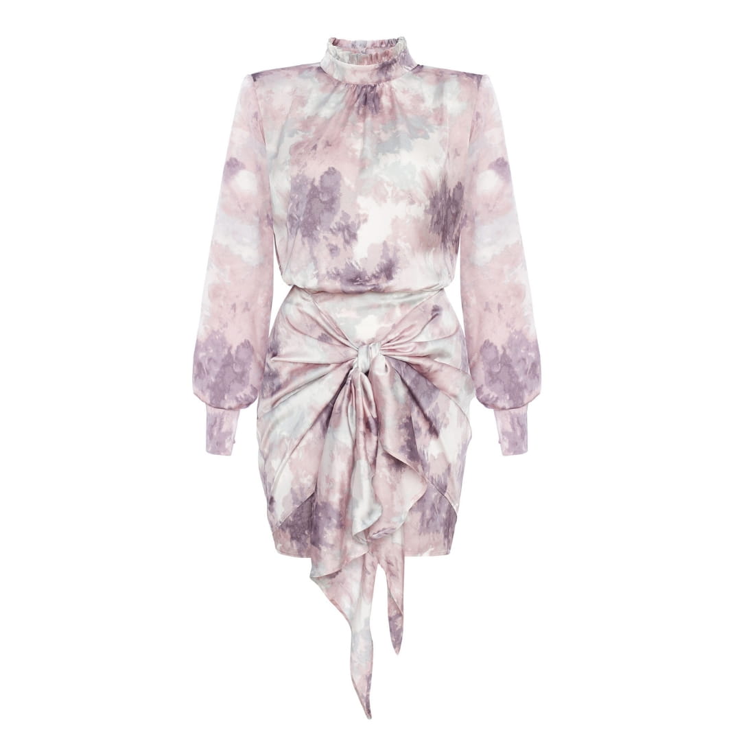 Mini sukienka ze sójką i wiązaniem na biodrach Marble by Swing w kolorze marmurowym