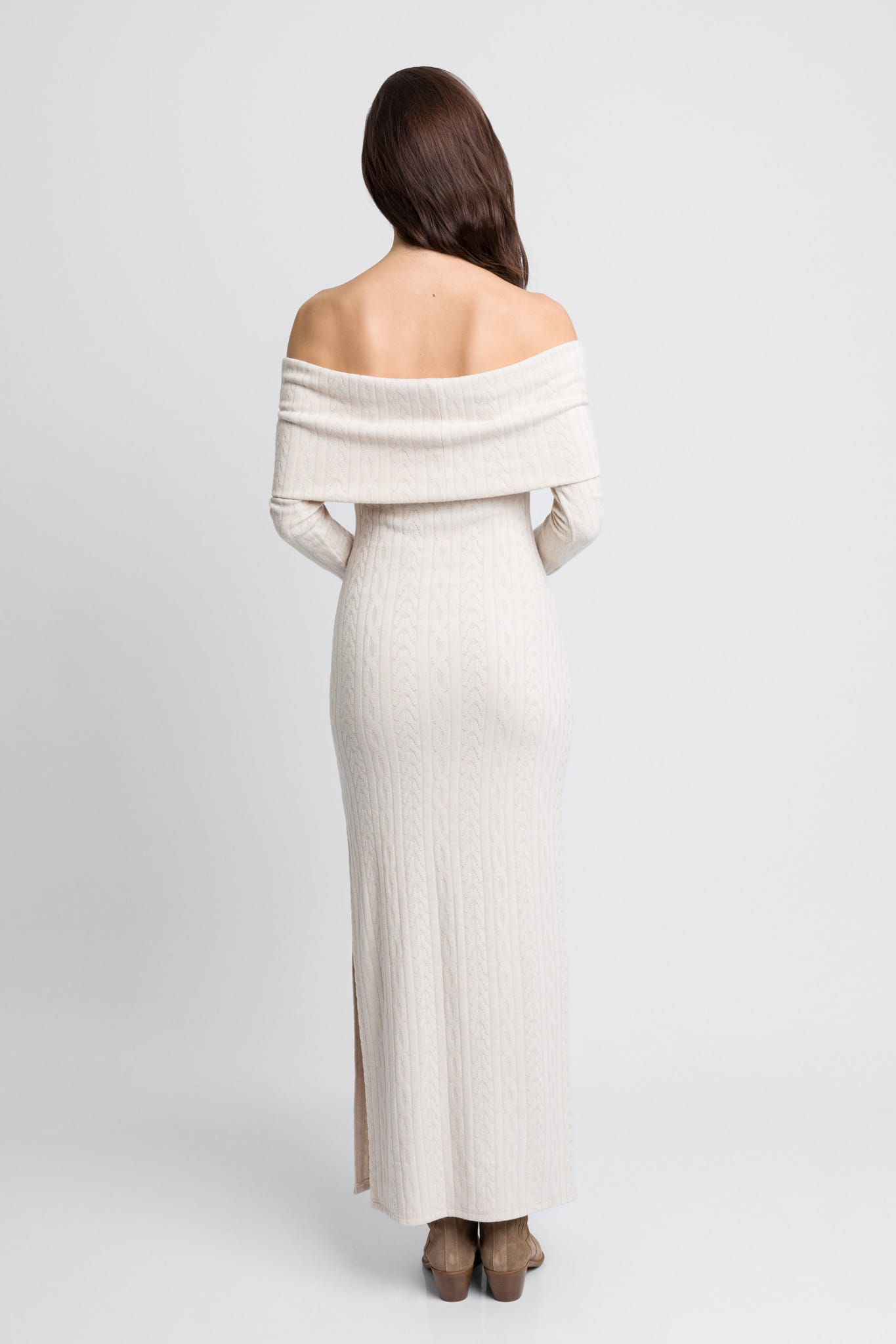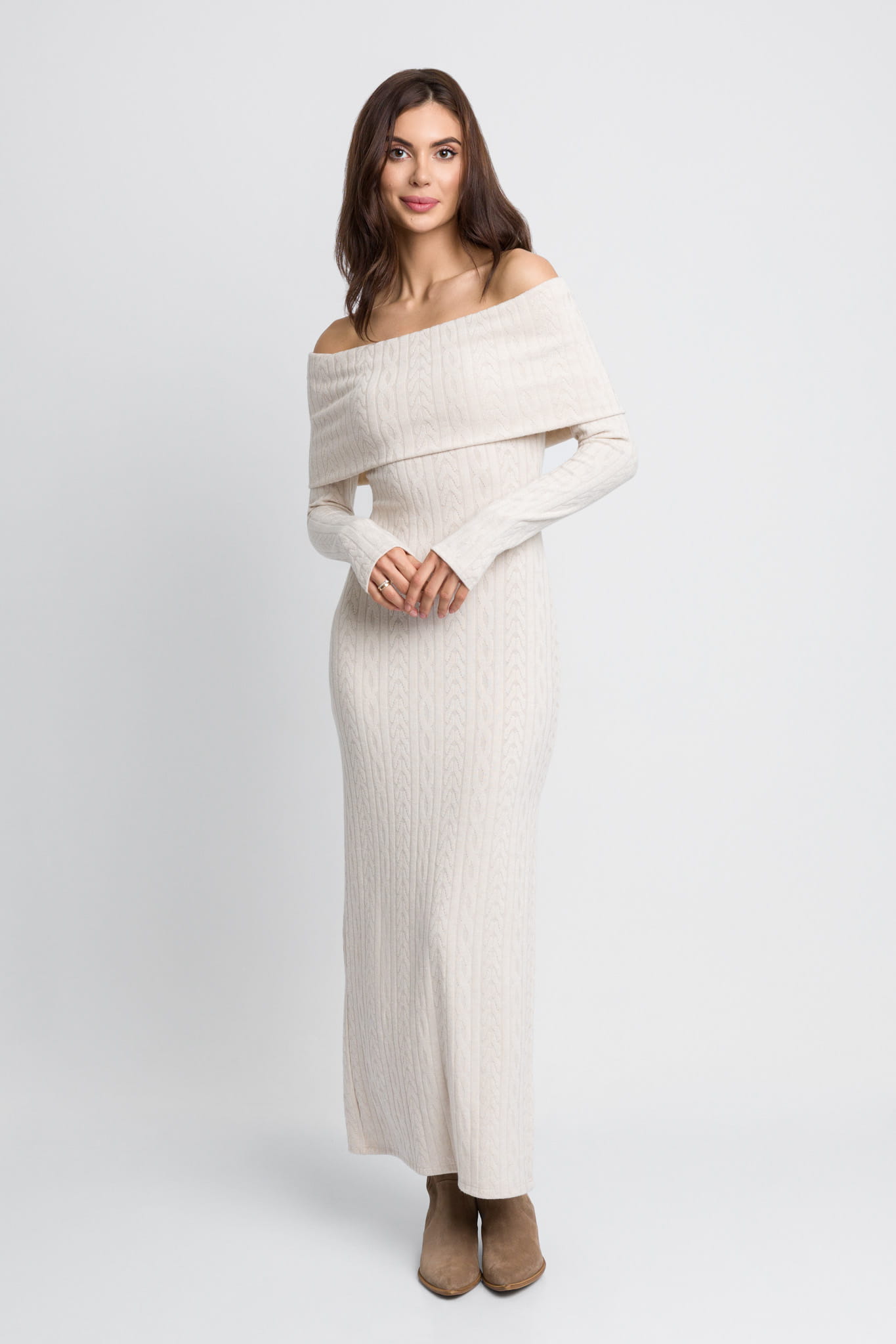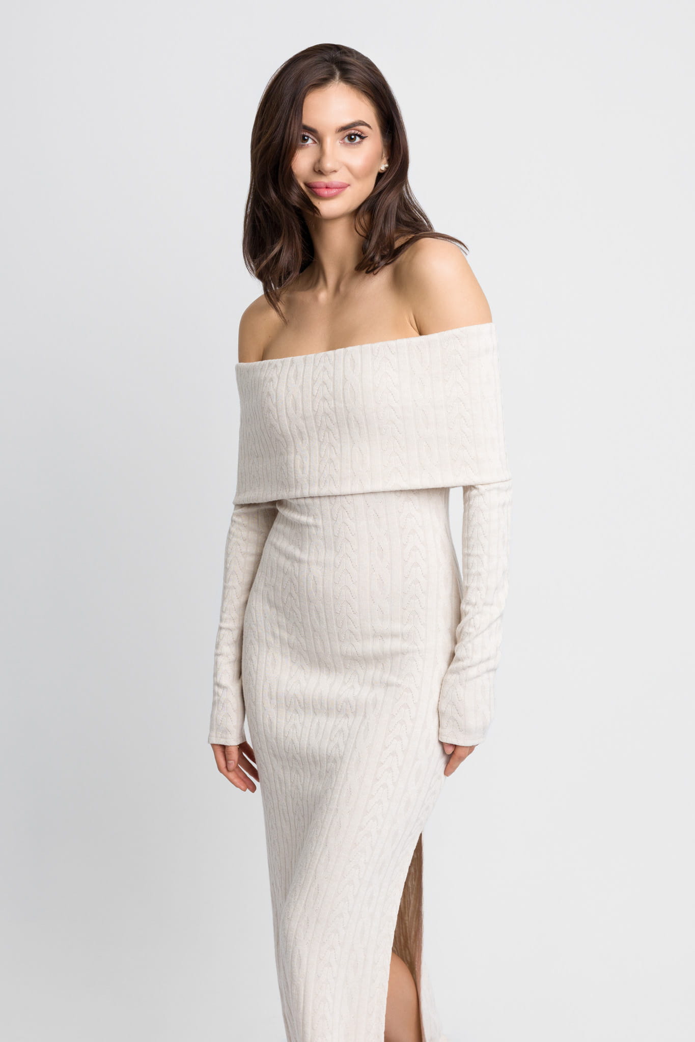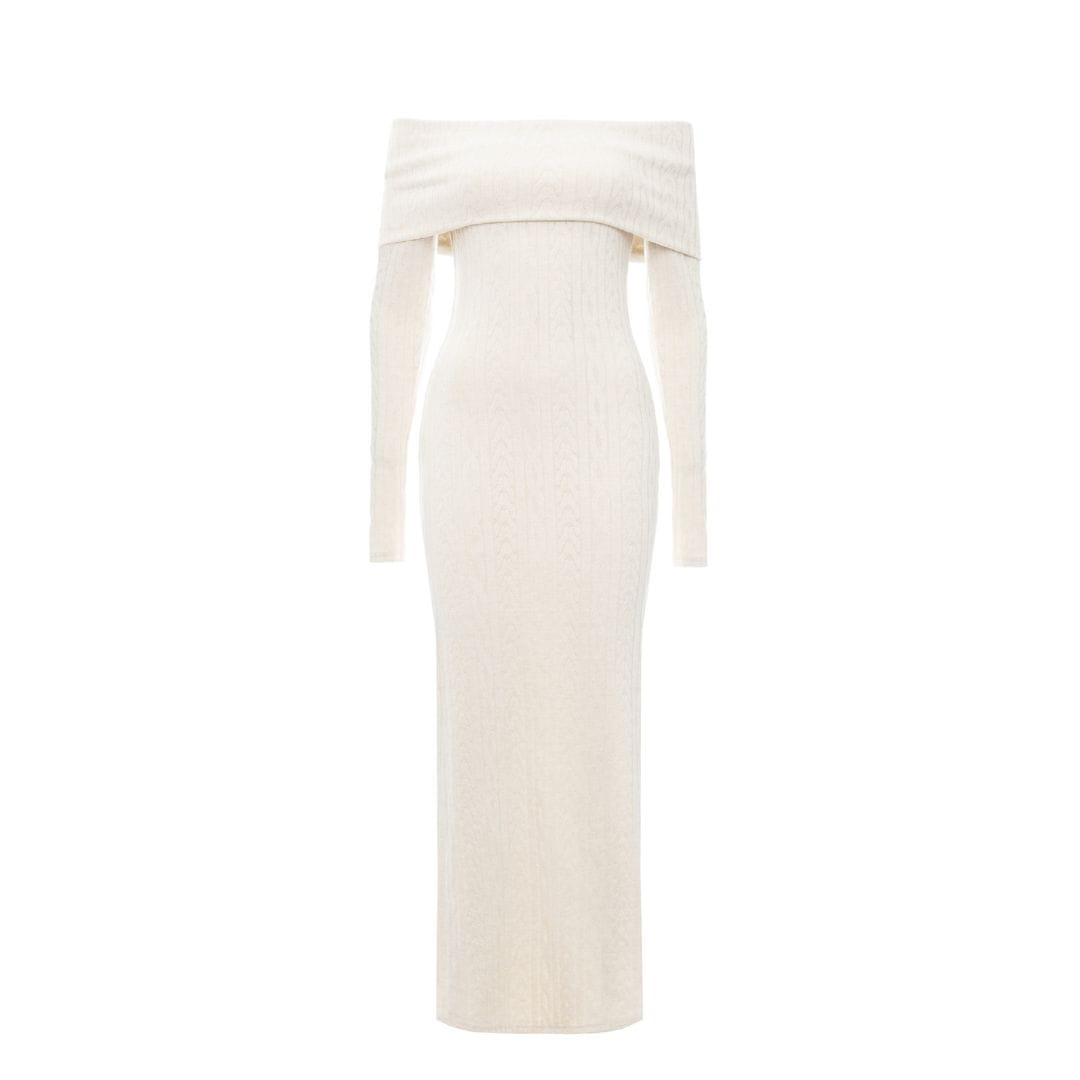Śmietankowa długa dzianinowa sukienka z hiszpańskim dekoltem i rozporkiem Tori by Swing