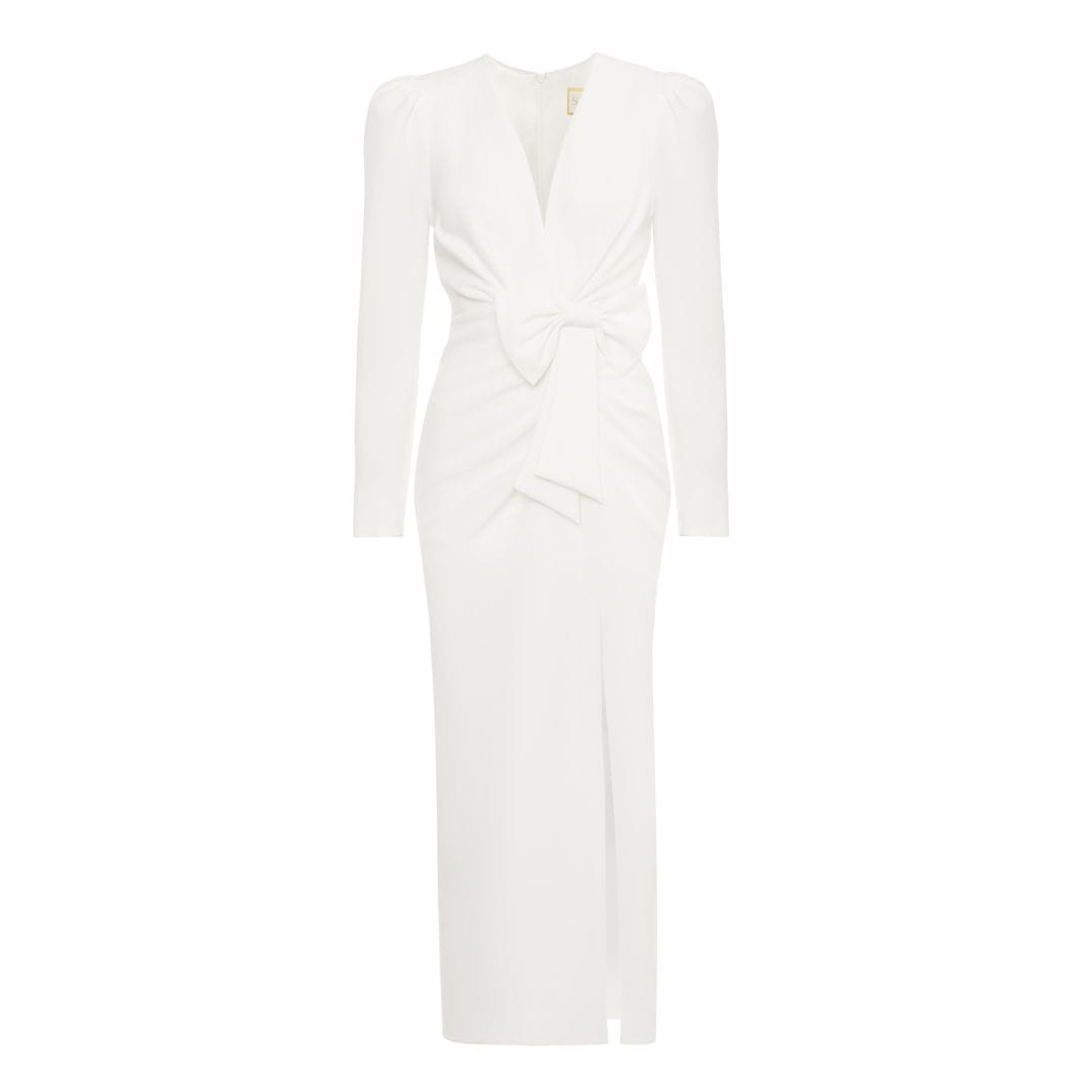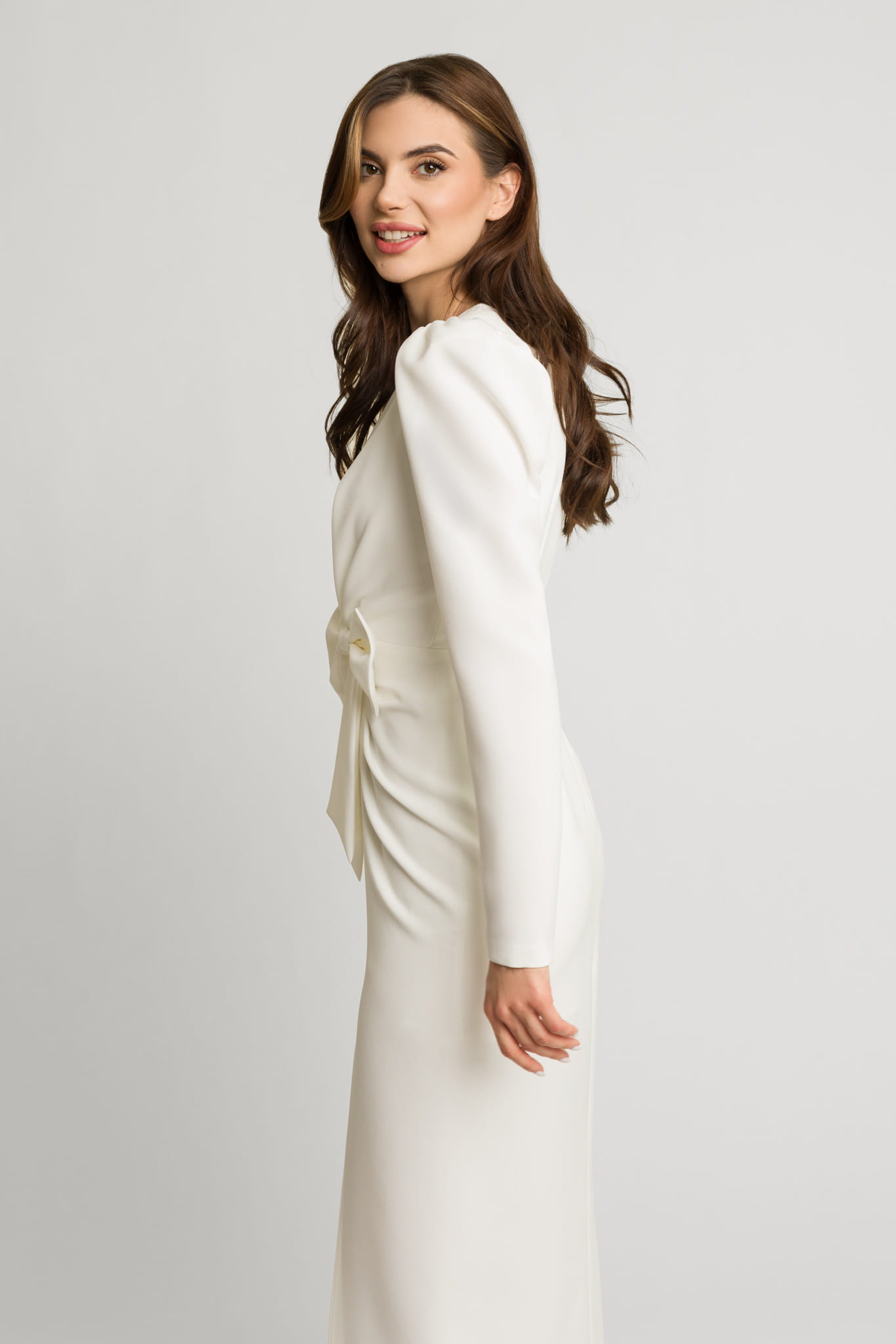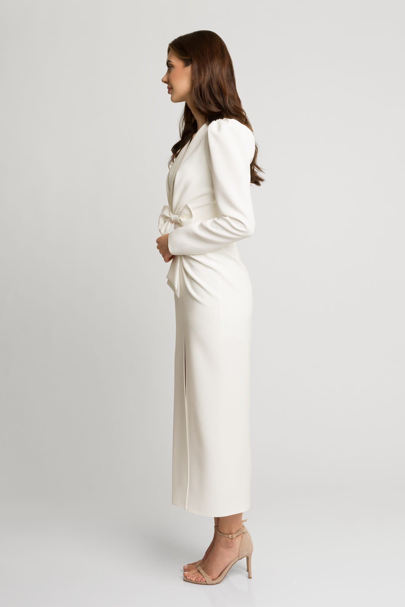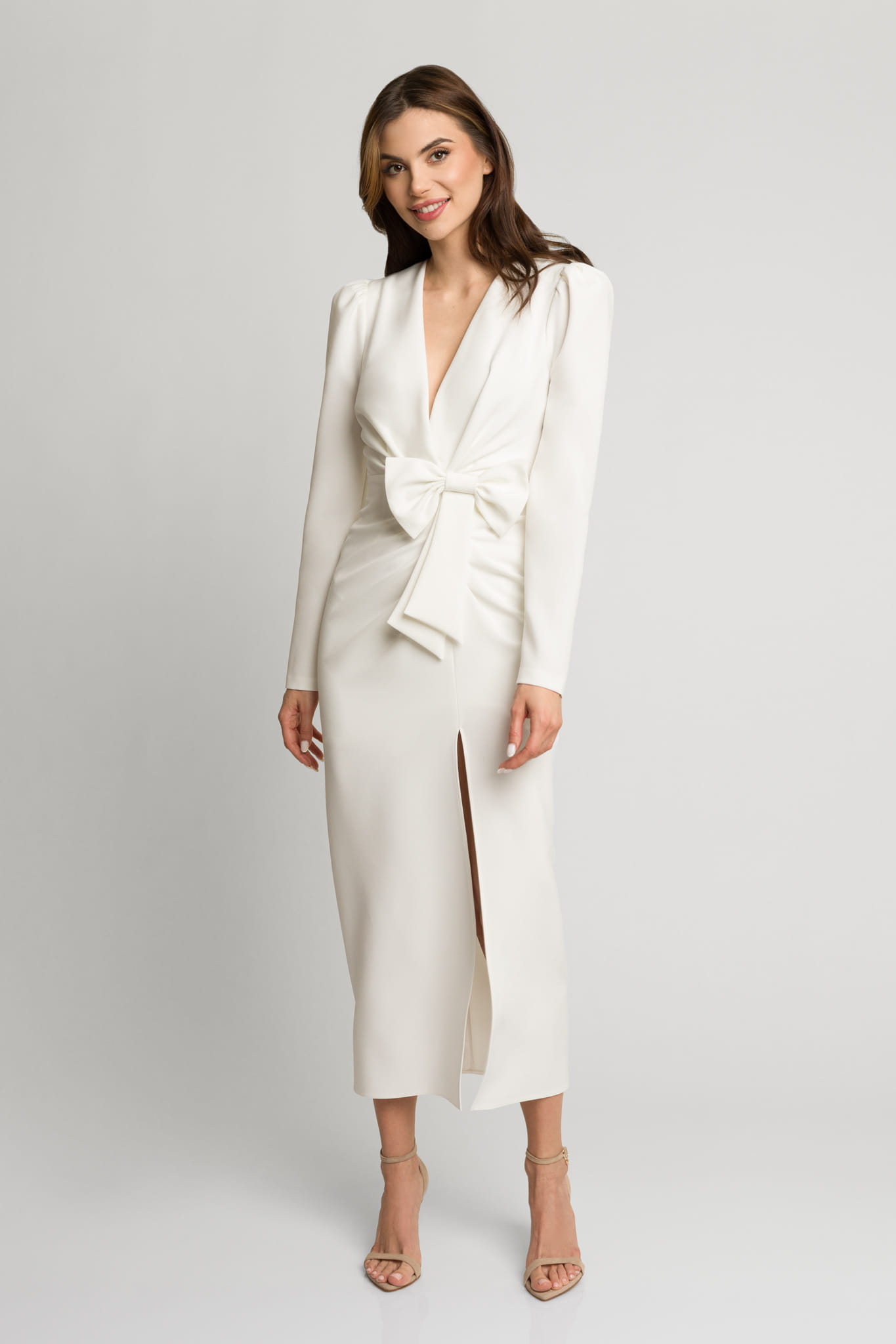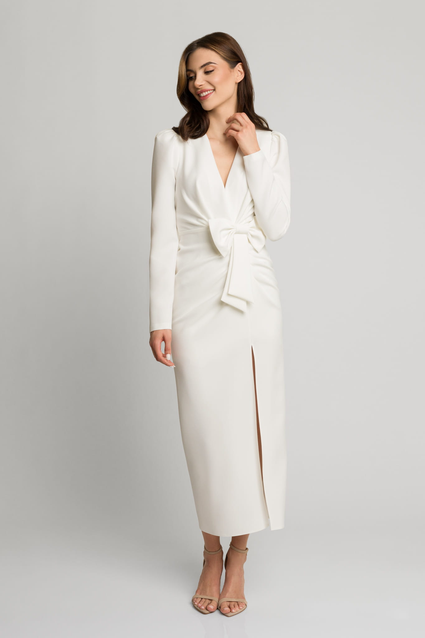 Śmietankowa elegancka dopasowana sukienka midi z rozporkiem i ozdobną kokardą Fiona by Swing