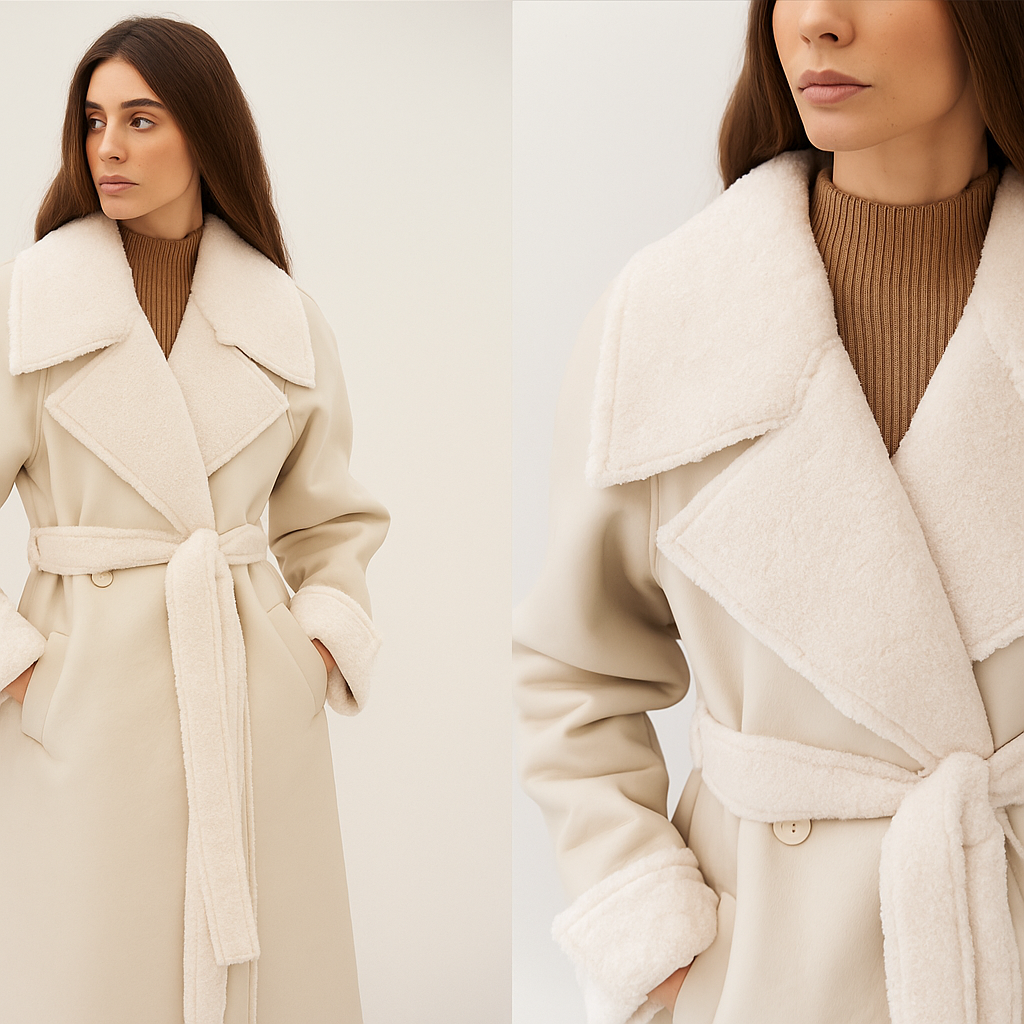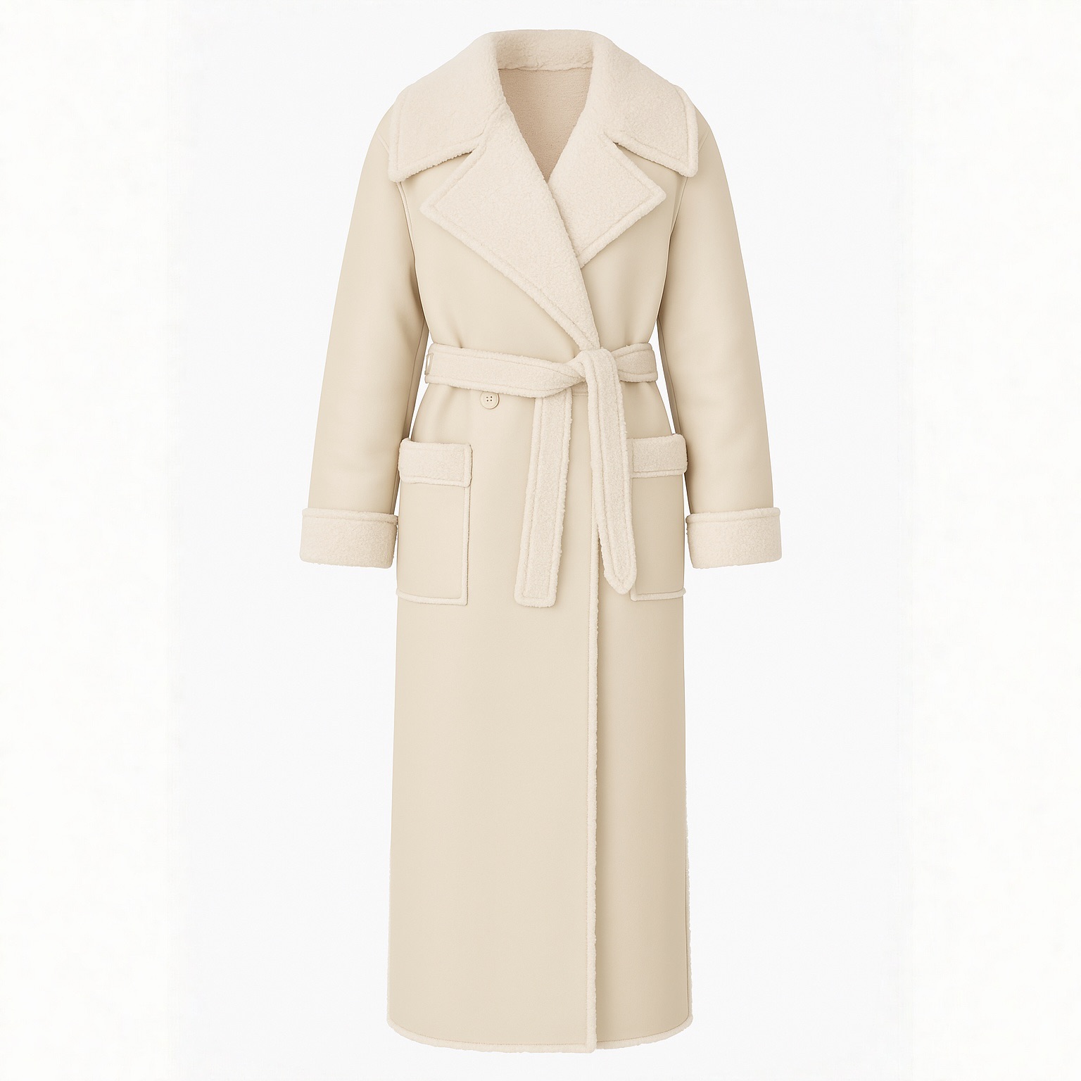 Śmietankowy ciepły wełniany długi kożuch ecru z paskiem Teddy
